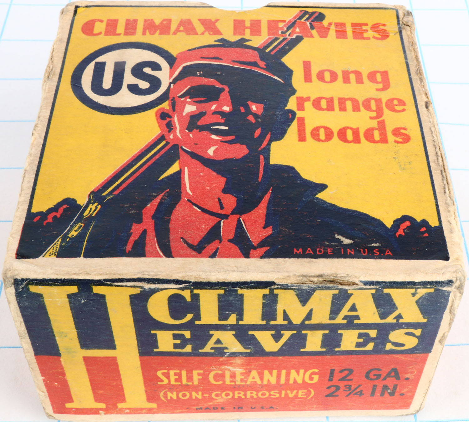 US Cart. Co., Happy Hunter Box, Climax Heavies, 2 3/4'', 12ga., 1pc., Empty, shot size 6CH, yellow, red, black & white box, box has scuffing, light soiling & torn top inside flap with very nice colors. Grade: Very Good ++ - Value: 100 to 400