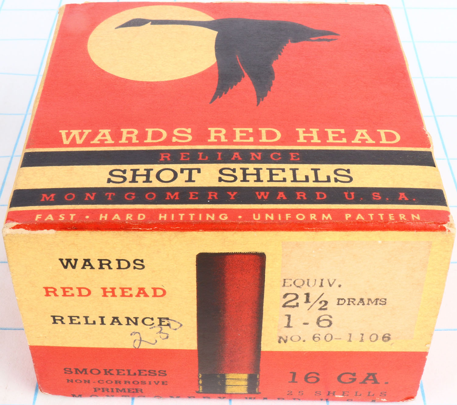 Montgomery Ward & Co., Red Head Reliance, 16ga., 1pc., Full, shot size 6, red background with black goose flying through the moon, box has shell protrusion & light soiling with great colors, shells are excellent. Grade: Excellent - Value: 20 to 60