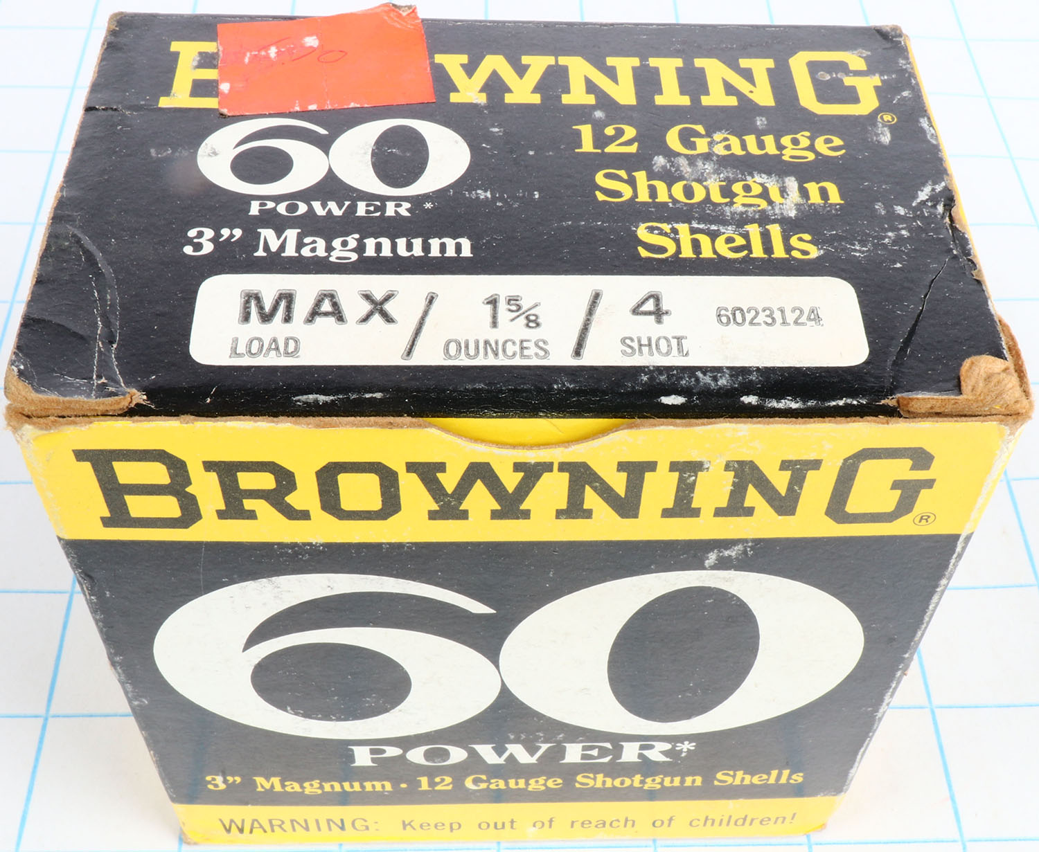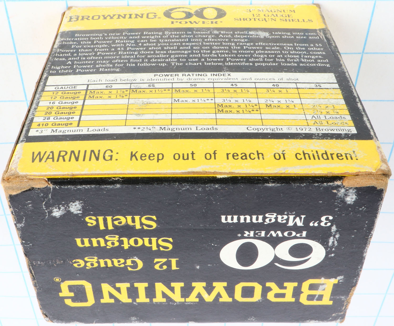 Browning, 60 Power, 12ga., 1pc., Full, shot size 4, 3'' MAGNUM, black, yellow & white box, box is solid with very nice color, shells are excellent. Grade: Excellent - Value: 10 to 40