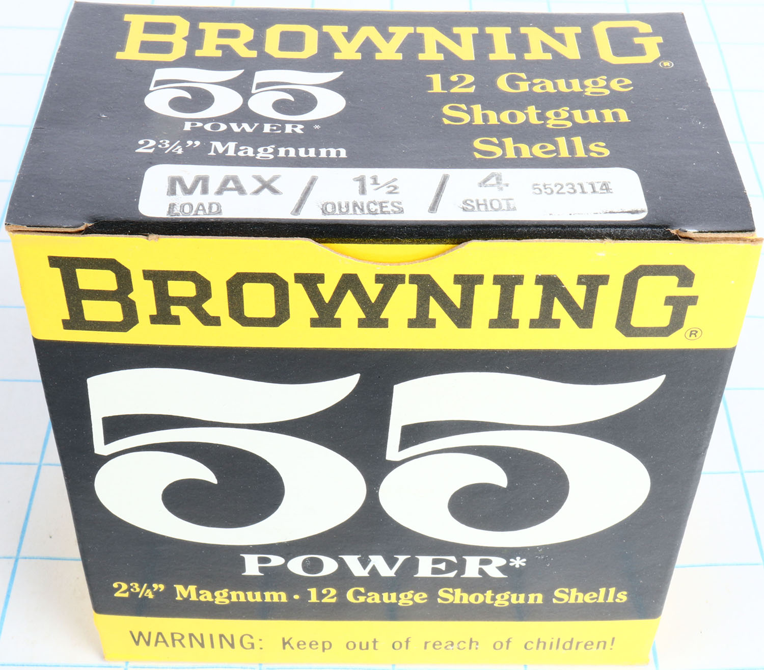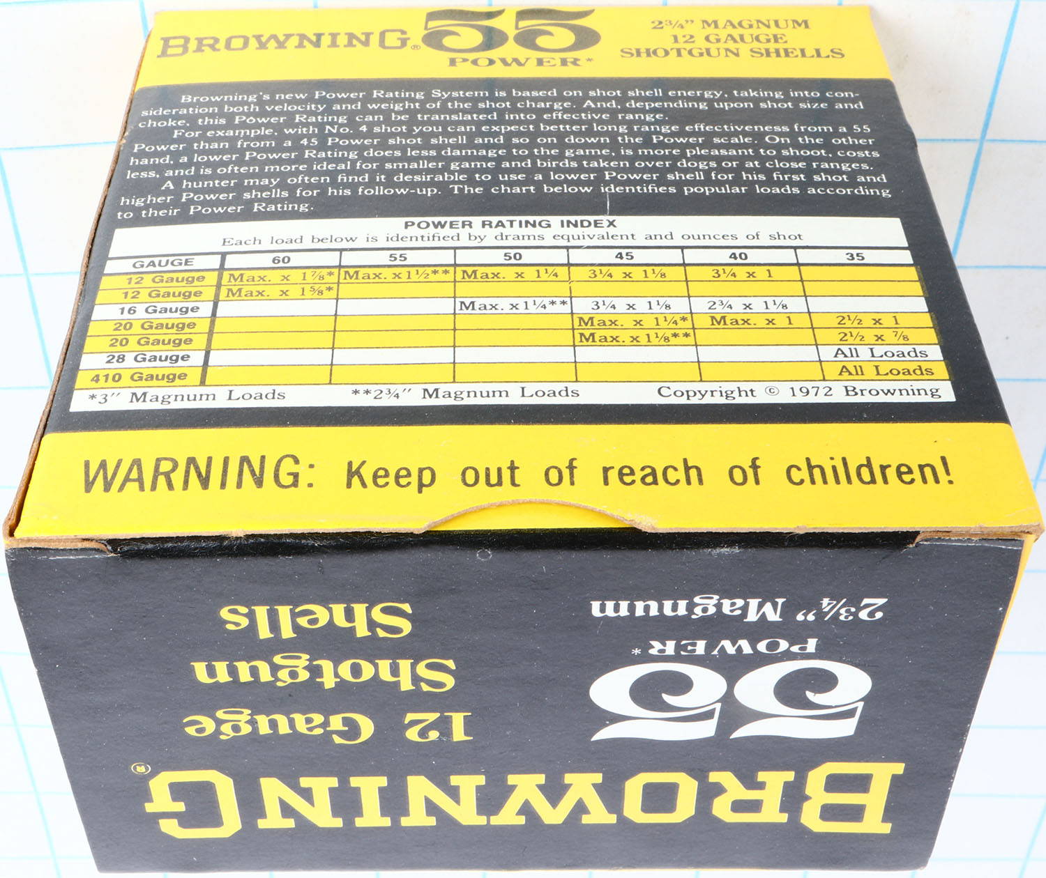 Browning, 55 Power, 12ga., 1pc., Full, shot size 4, 2 3/4'' MAGNUM, black, yellow & white box, box is solid with great color, shells are excellent. Grade: Excellent + - Value: 10 to 40