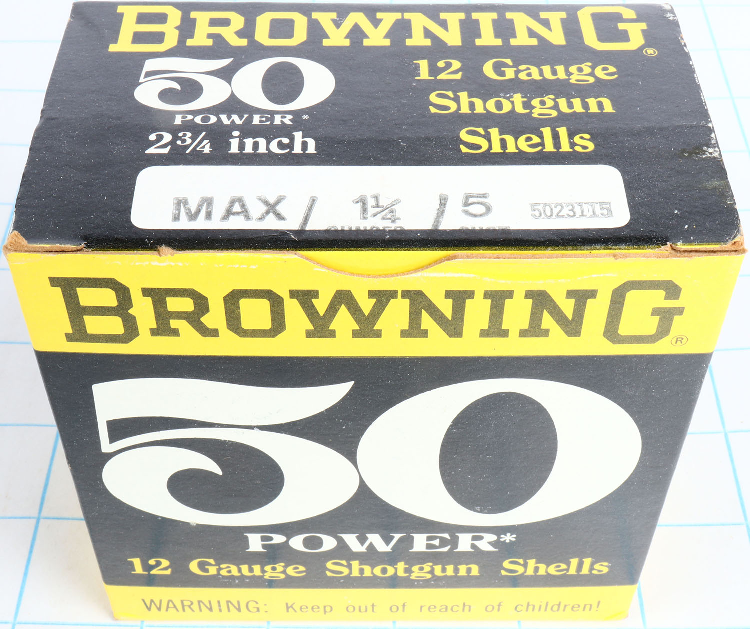 Browning, 50 Power, 12ga., 1pc., Full, shot size 5, 2 3/4'', black, yellow & white box, box is solid with great color, shells are excellent. Grade: Excellent + - Value: 10 to 40