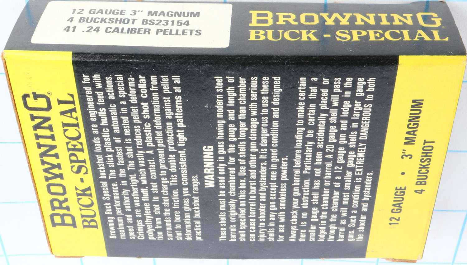 Browning, Buck Special, 12ga., 1pc., Full, shot size 4 Buckshot, 3'' Magnum, black, yellow & white box, box is solid with great color, shells are excellent. Grade: Excellent + - Value: 8 to 20