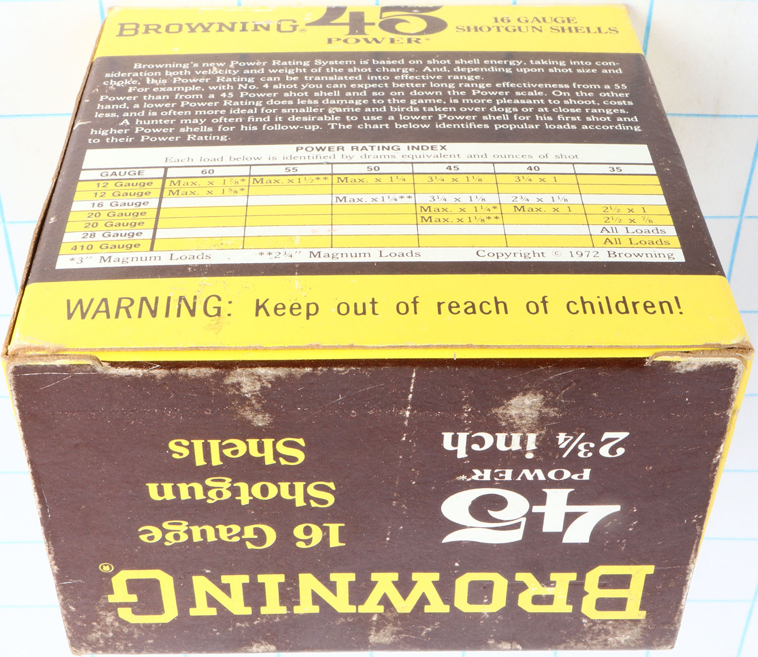 Browning, 45 Power, 16ga., 1pc., Full, shot size 7 1/2, 2 3/4'', brown, yellow & white box, box is solid with great color, shells are excellent. Grade: Excellent + - Value: 10 to 40