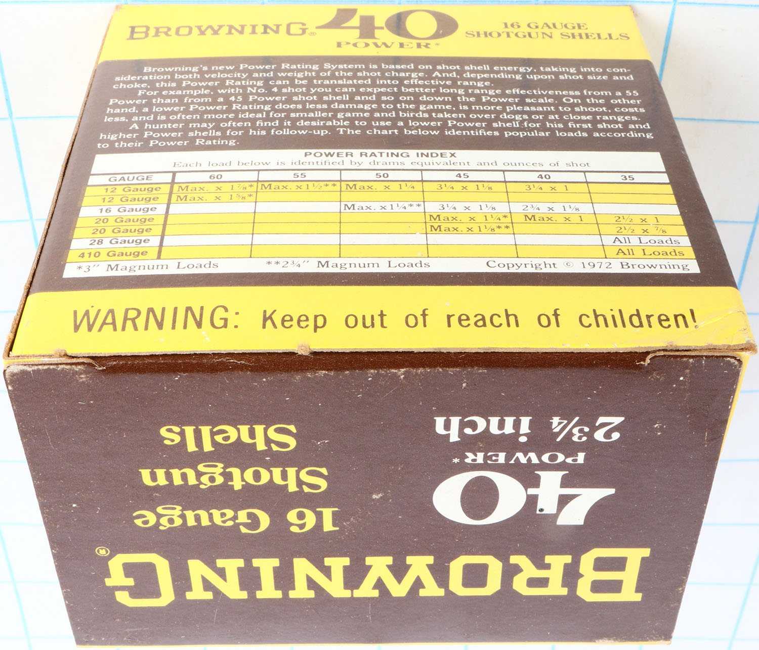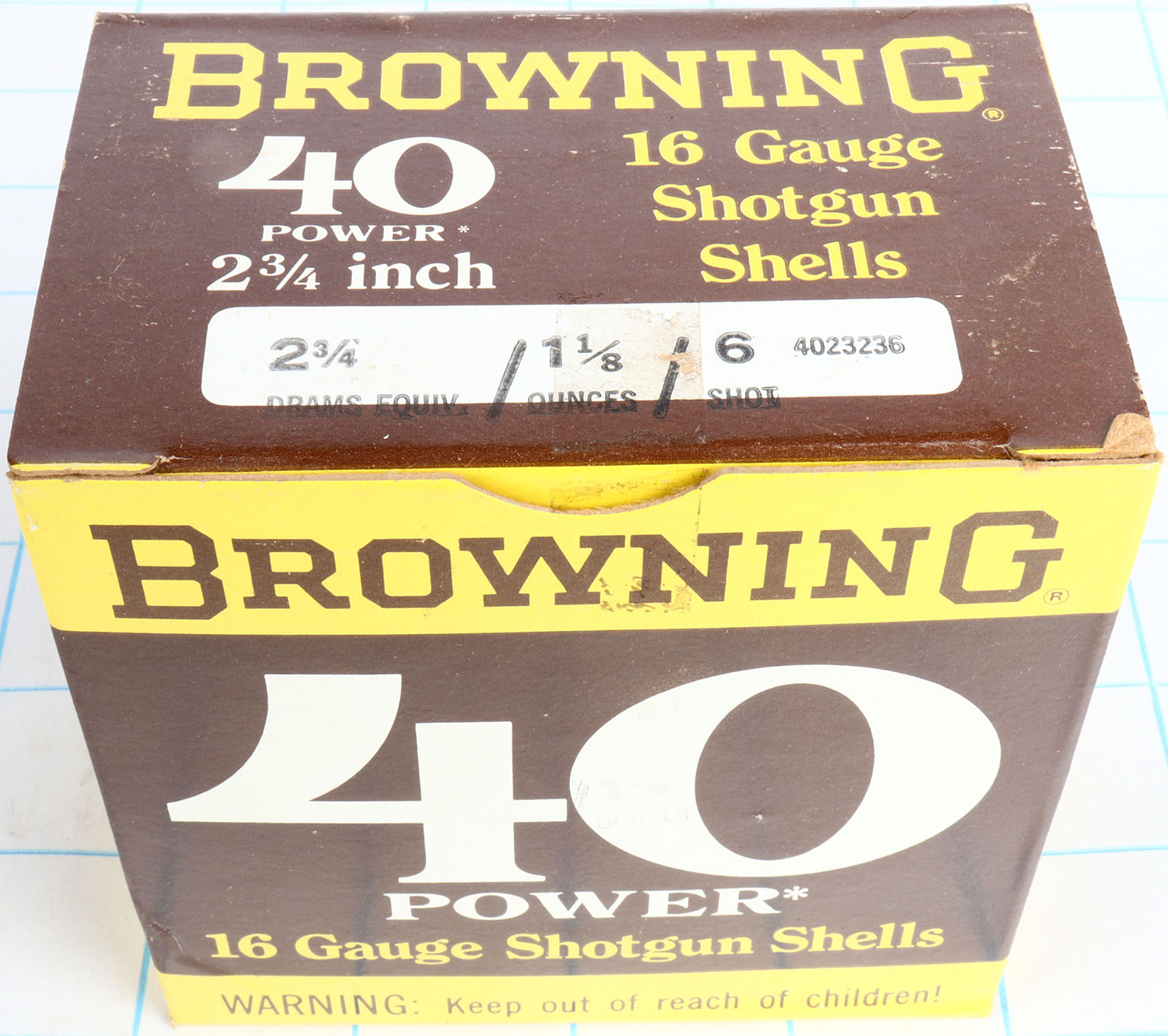 Browning, 40 Power, 16ga., 1pc., Full, shot size 6, 2 3/4'', brown, yellow & white box, box is solid with great color, shells are excellent. Grade: Excellent + - Value: 10 to 40