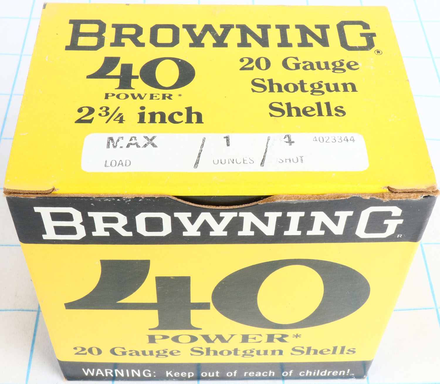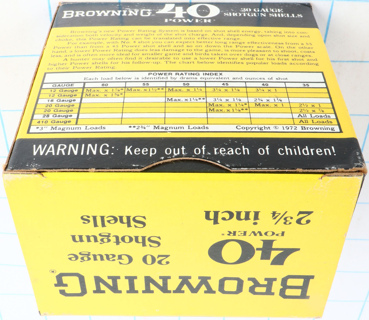 Browning, 40 Power, 20ga., 1pc., Full, shot size 4, 2 3/4'', black, yellow & white box, box is solid with great color, shells are excellent. Grade: Excellent + - Value: 10 to 40