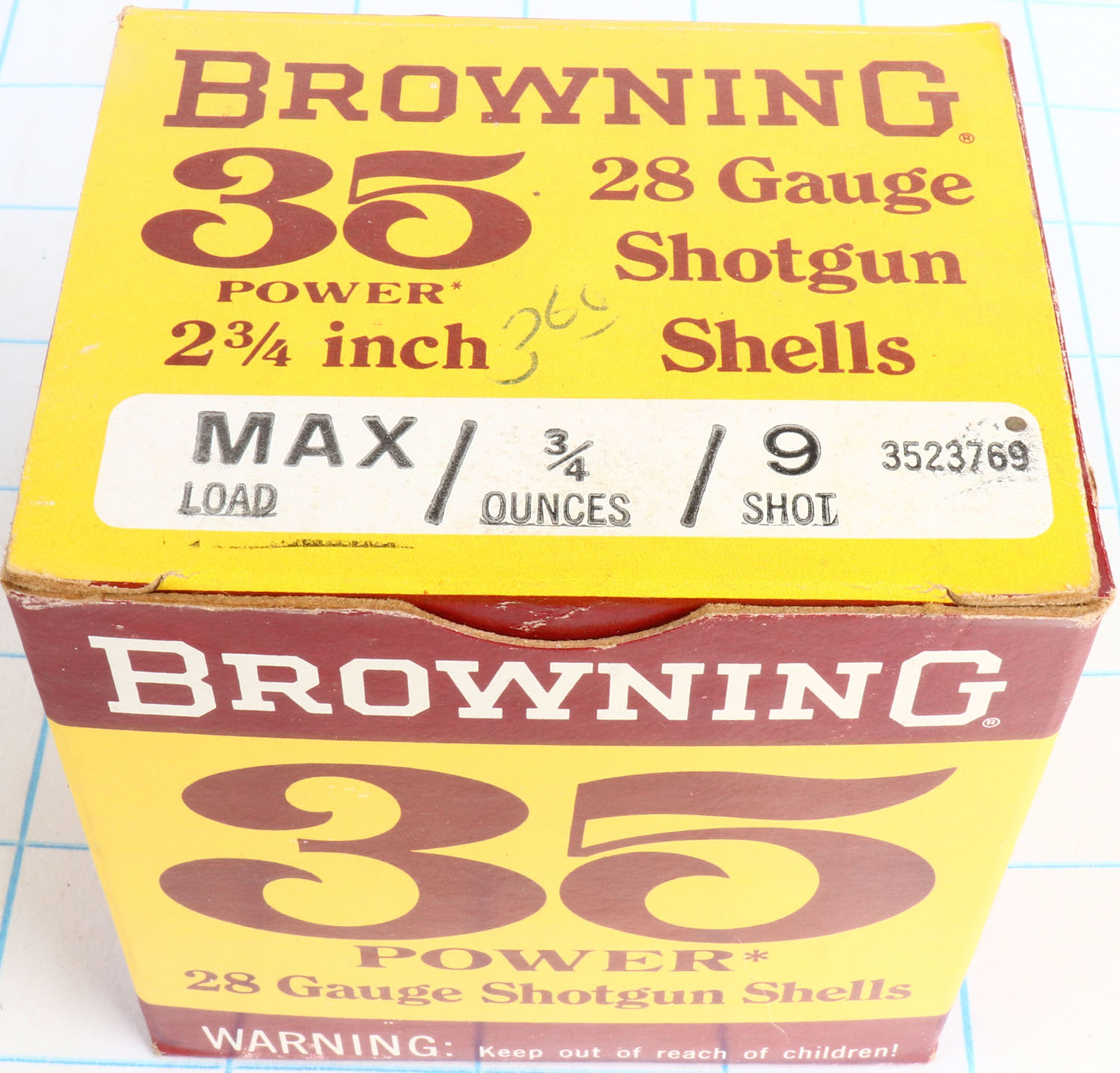Browning, 35 Power, 28ga., 1pc., Partial 23rds, shot size 9, 2 3/4'', maroon, yellow & white box, box is solid with great color, shells are excellent. Grade: Excellent - Value: 10 to 40