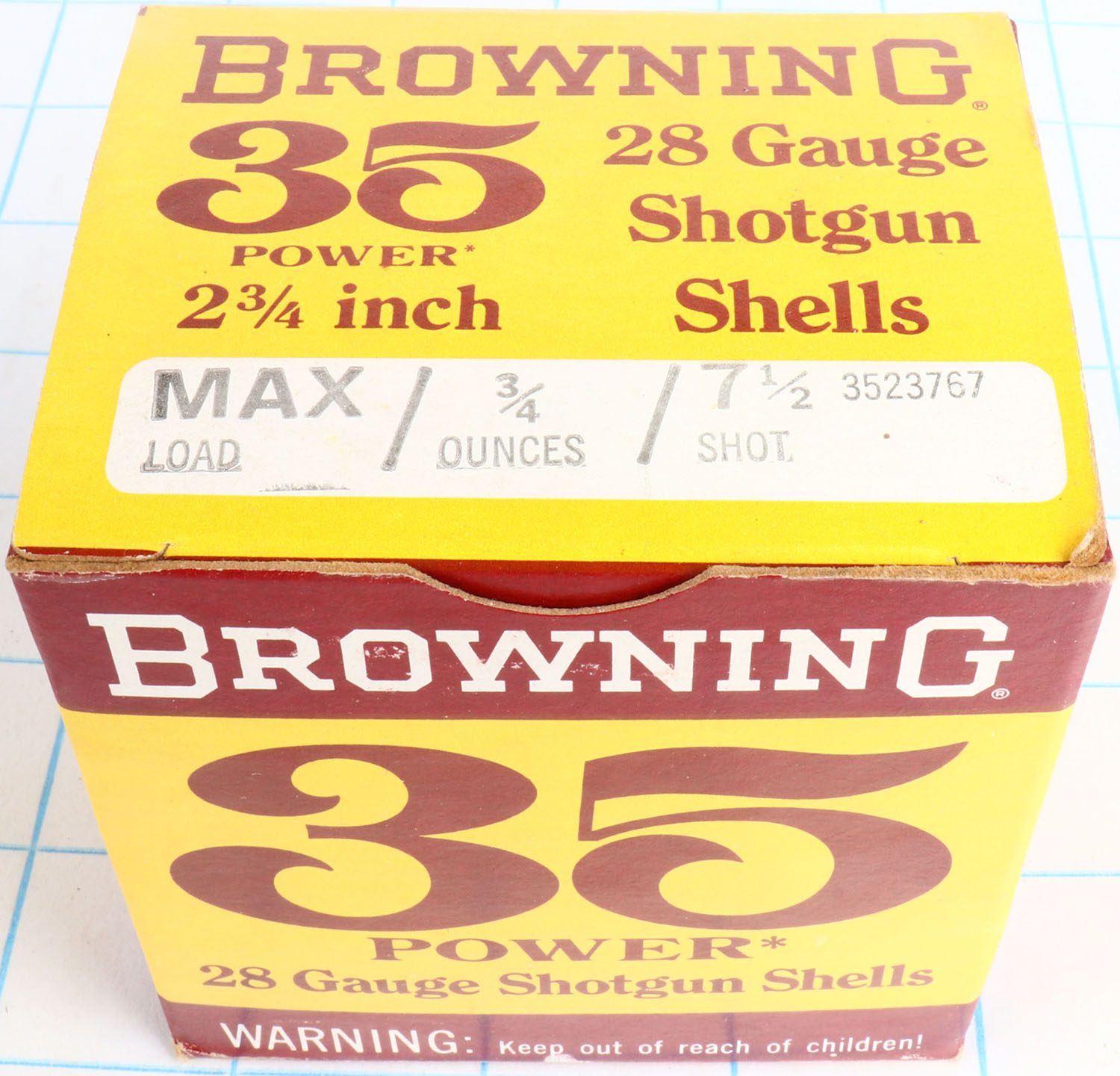 Browning, 35 Power, 28ga., 1pc., Full, shot size 7 1/2, 2 3/4'', maroon, yellow & white box, box is solid with great color, shells are excellent. Grade: Excellent - Value: 10 to 40