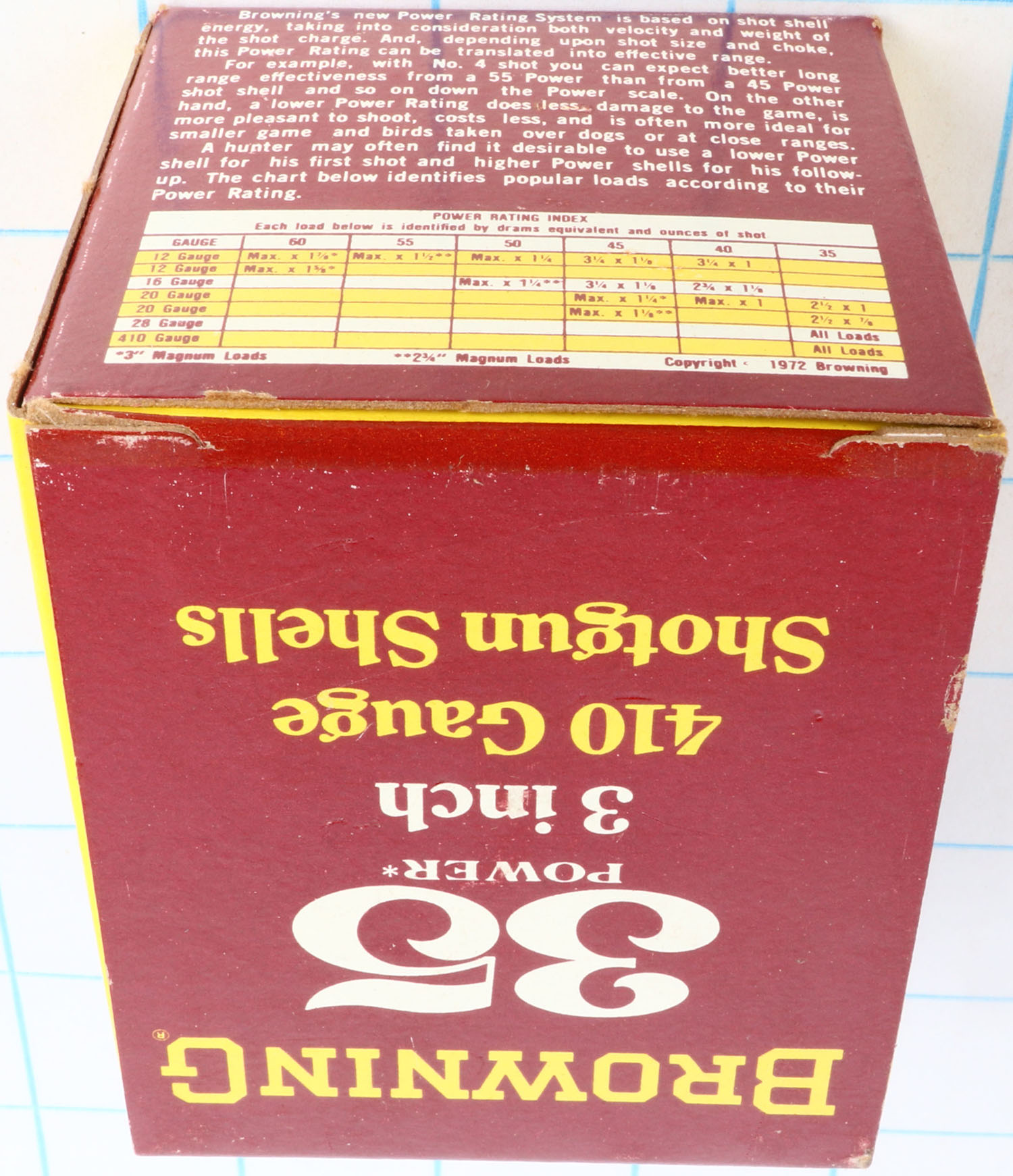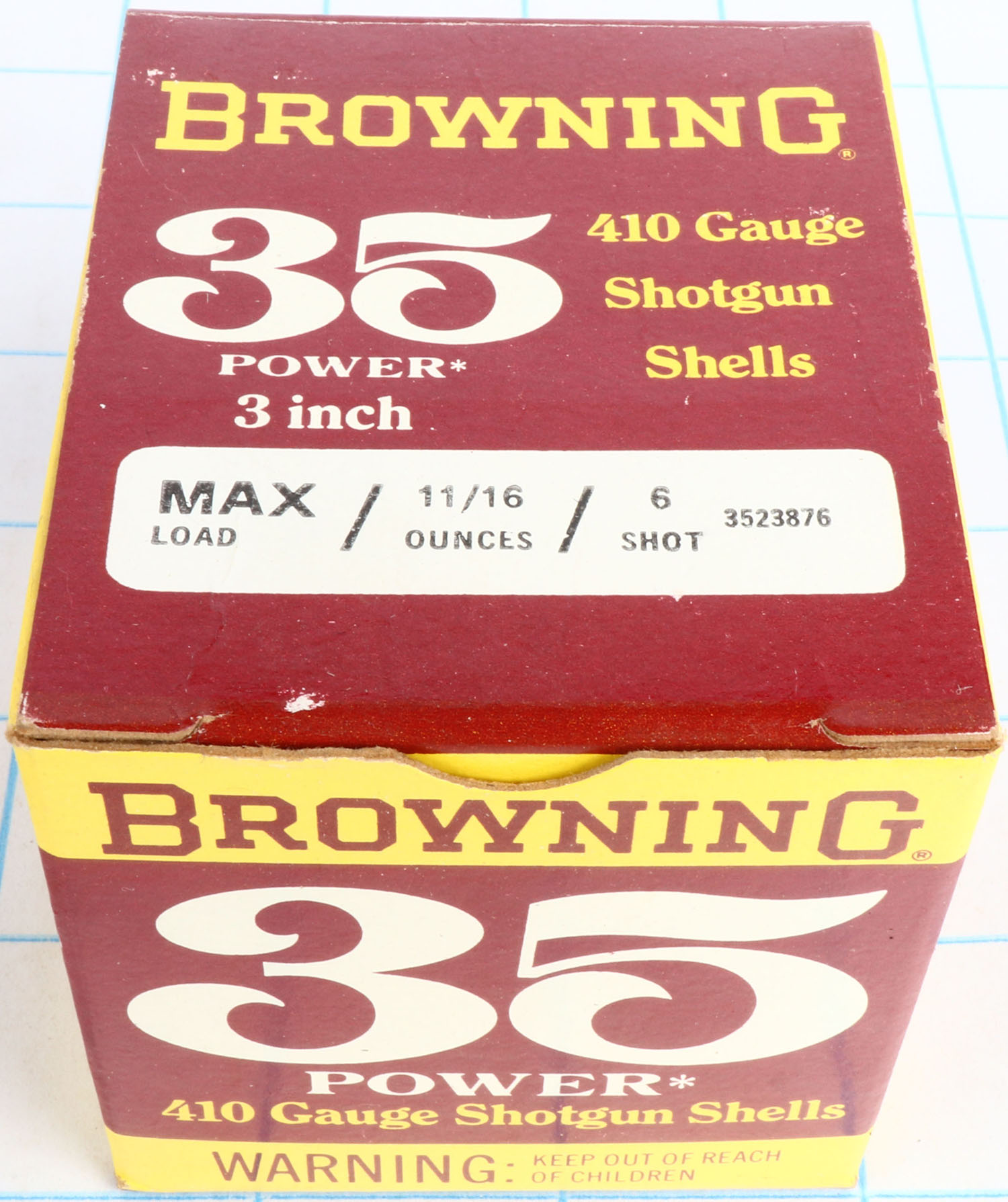 Browning, 35 Power, 28ga., 1pc., Full, shot size 7 1/2, 2 3/4'', maroon, yellow & white box, box is solid with great color, shells are excellent. Grade: Excellent - Value: 10 to 40