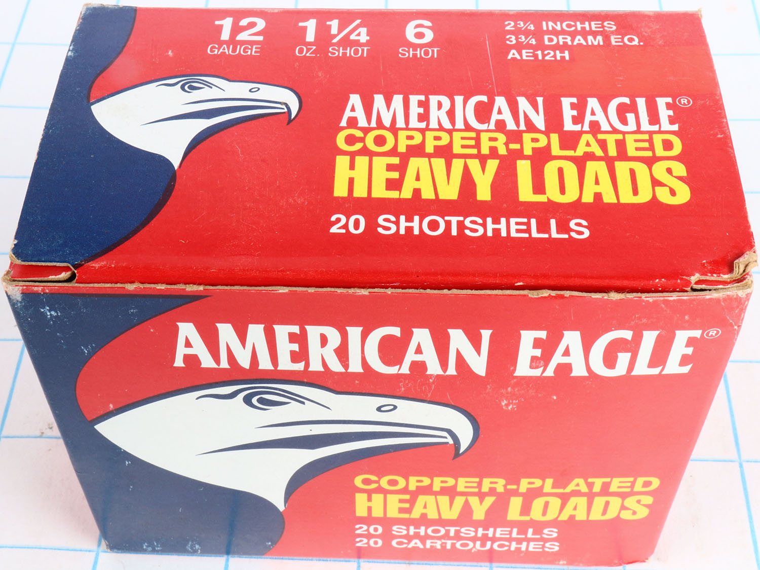 American Eagle, 12ga., 1pc., Full, shot size 6, 2 3/4'', multi-colored box, box is solid with great color, shells are excellent. Grade: Excellent + - Value: 10 to 30