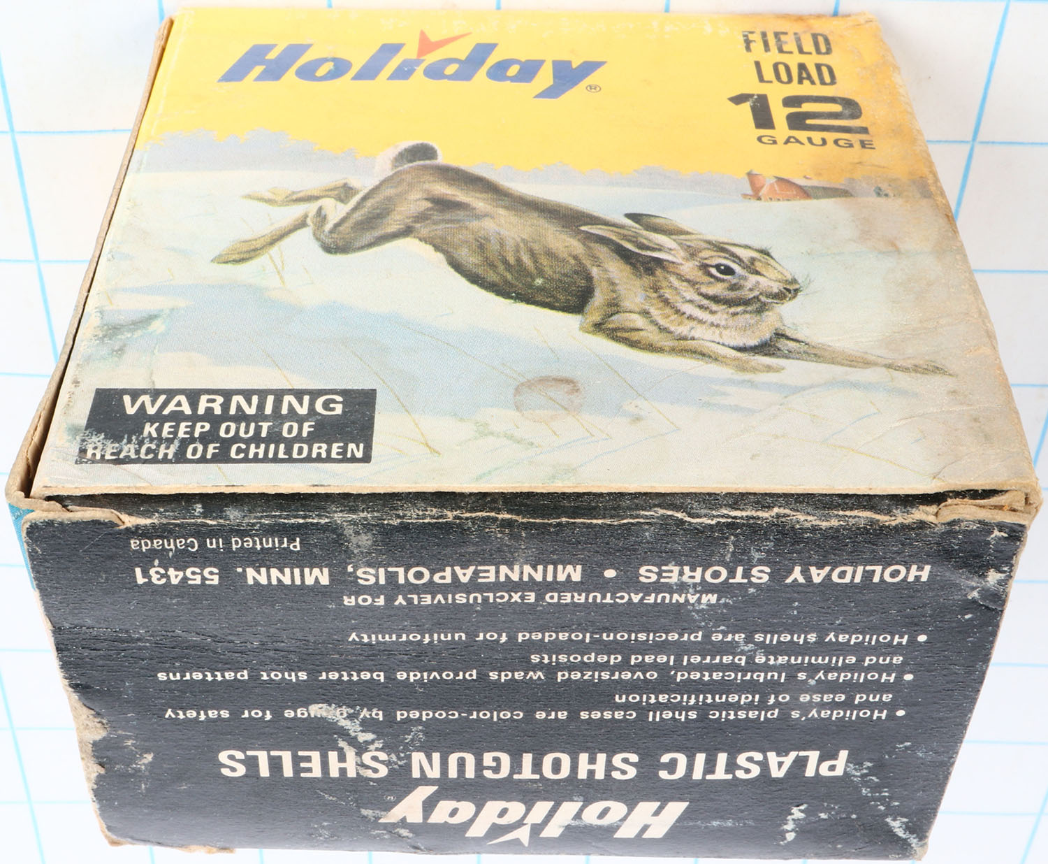 Holiday, Grouse/Rabbit Scene, 12ga., 1pc., Empty, 2 3/4'', shot size 8, multi color graphics of Grouse/Rabbit by Les Kouba, box has scuffing, light edge wear & light soiling with very nice colors. Grade: Very Good ++ - Value: 10 to 40