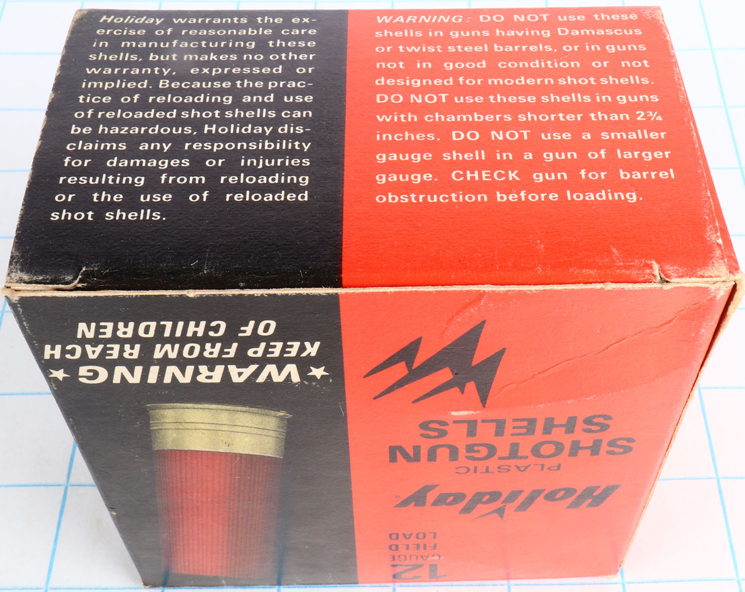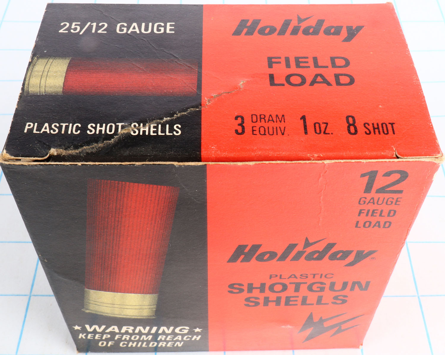 Holiday, Field Load, 12ga., 1pc., Empty, shot size 8, 2 3/4'', multi-colored box, box has glue repair with great color. Grade: Excellent - Value: 6 to 20