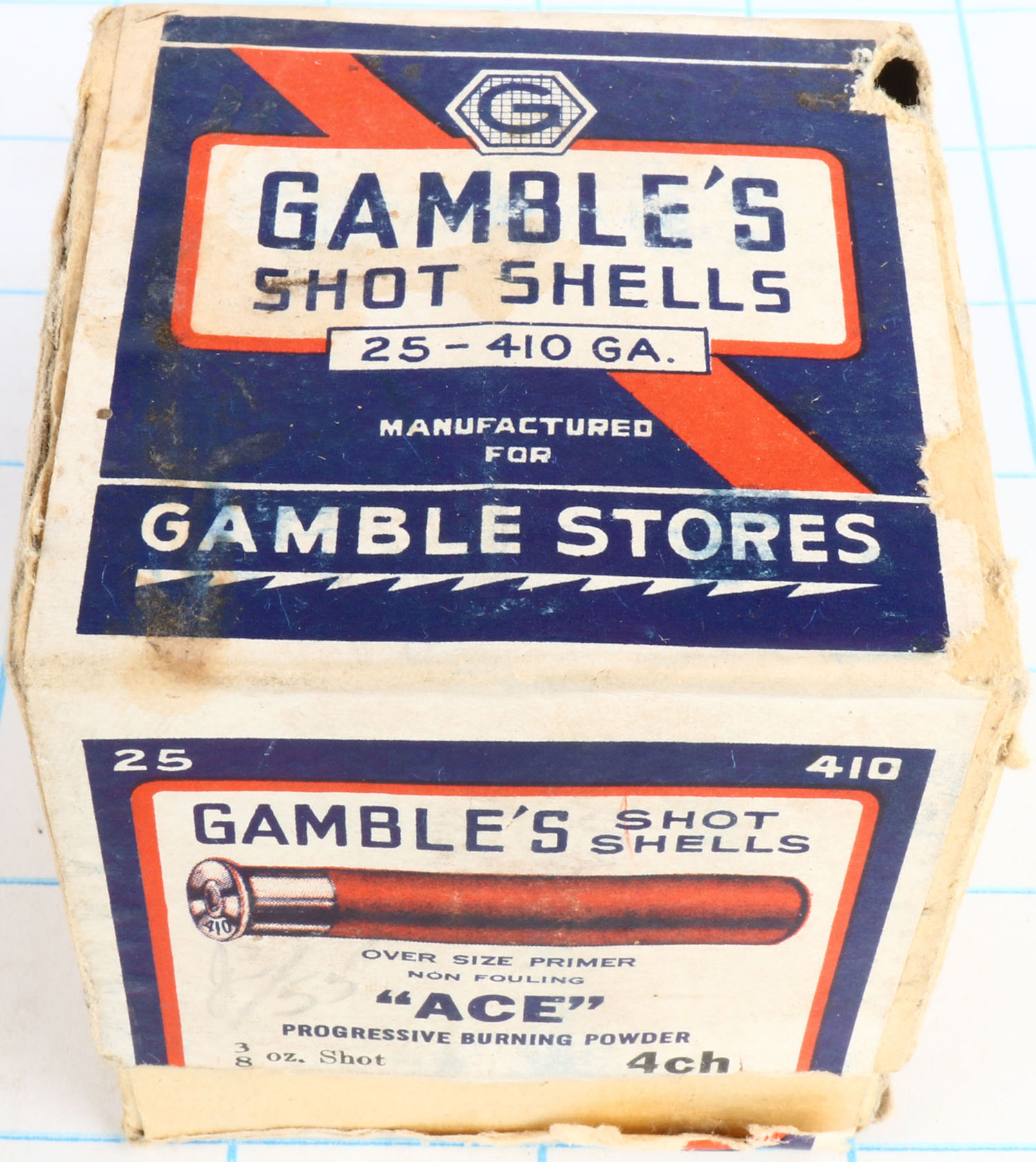 Gambles Shot Shells, ACE, 410ga., 2pc., Partial 20rds all are fired paper shells, shot size 4ch, blue, orange & white box, box has seam splits, light edge wear & light soiling with very good colors. Grade: Very Good ++ - Value: 50 to 400