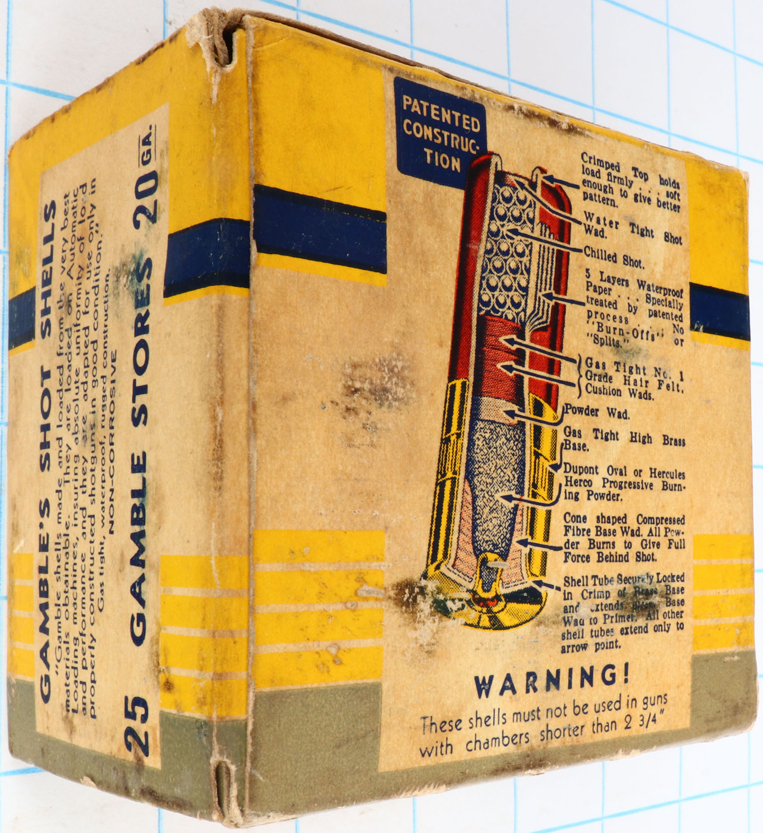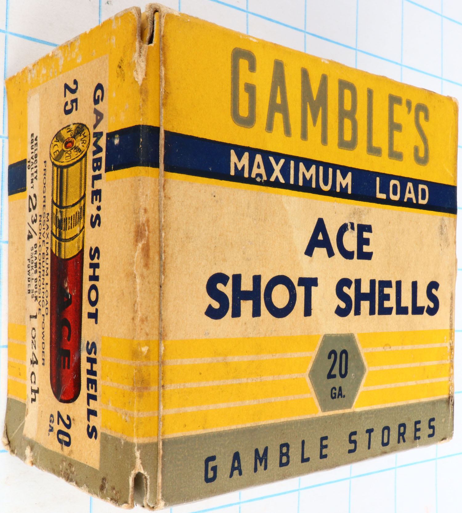 Gambles, ACE Shot Shells with Insert, 12ga., 1pc., Full, shot size 4ch, buff, blue, yellow & grey box, box is solid with soiling, light edge wear & very nice colors, shells are very good. Grade: Very Good ++ - Value: 40 to 120