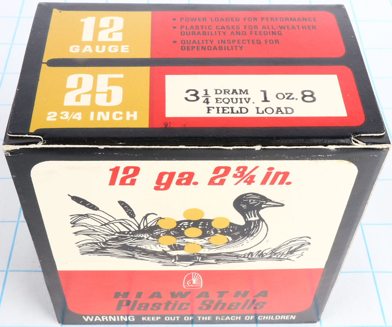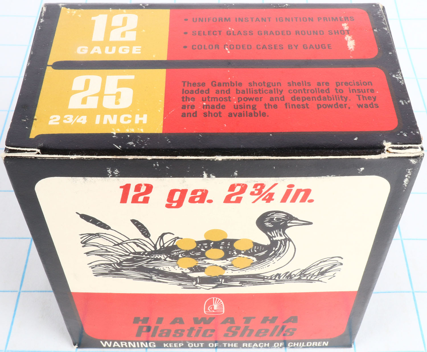 Gambles, Hiawatha, 12ga., 1pc., Full, shot size 8 Field Load, red, gold & black box, box is solid with great colors, shells are excellent. Grade: Excellent + - Value: 10 to 30