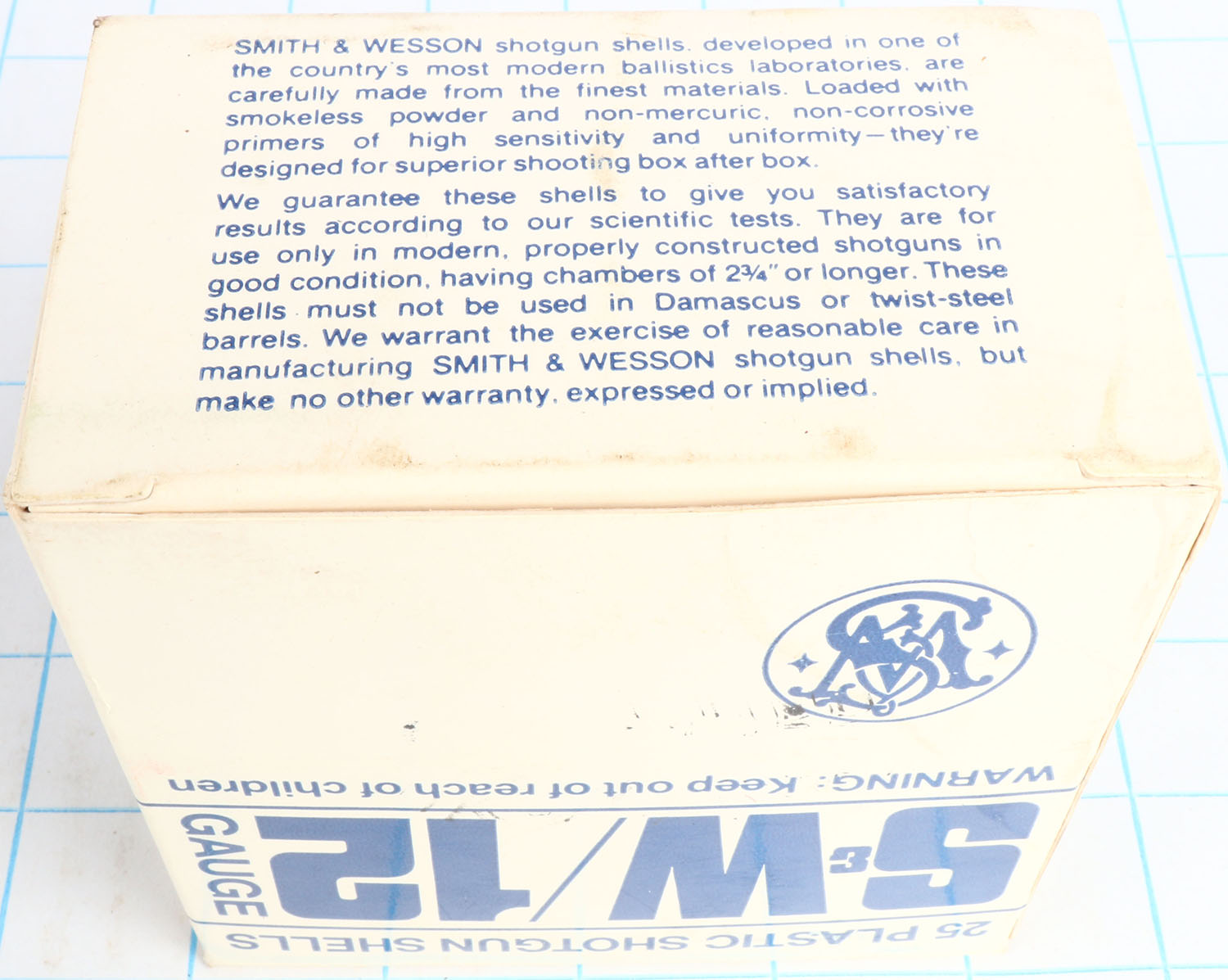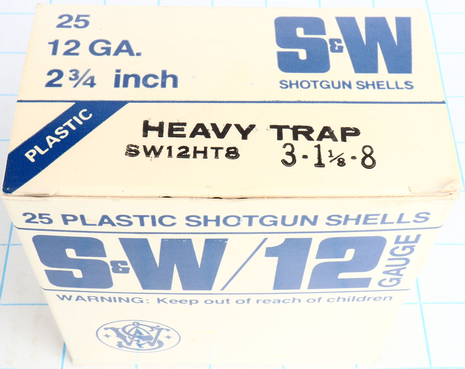 S&W, 12ga., 1pc., Full, shot size 8 Heavy Trap, box is solid, Shells are excellent. Grade: Excellent + - Value: 10 to 30