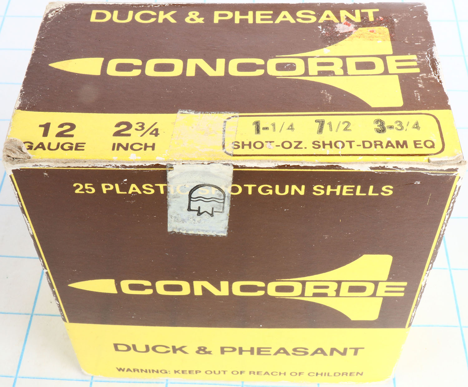 Concorde Duck & Pheasant, 12ga., 1pc., Full, shot size 7 1/2, multi-colored box, box is solid, shells are excellent. Grade: Excellent - Value: 10 to 30