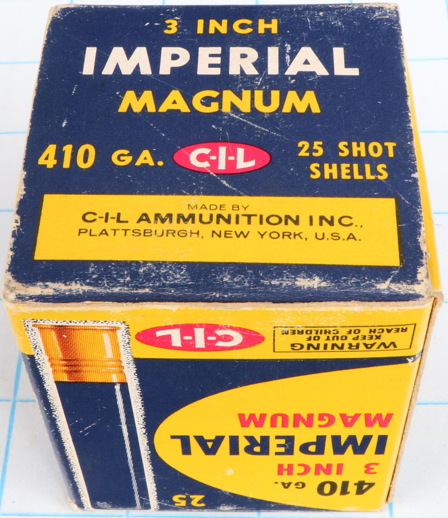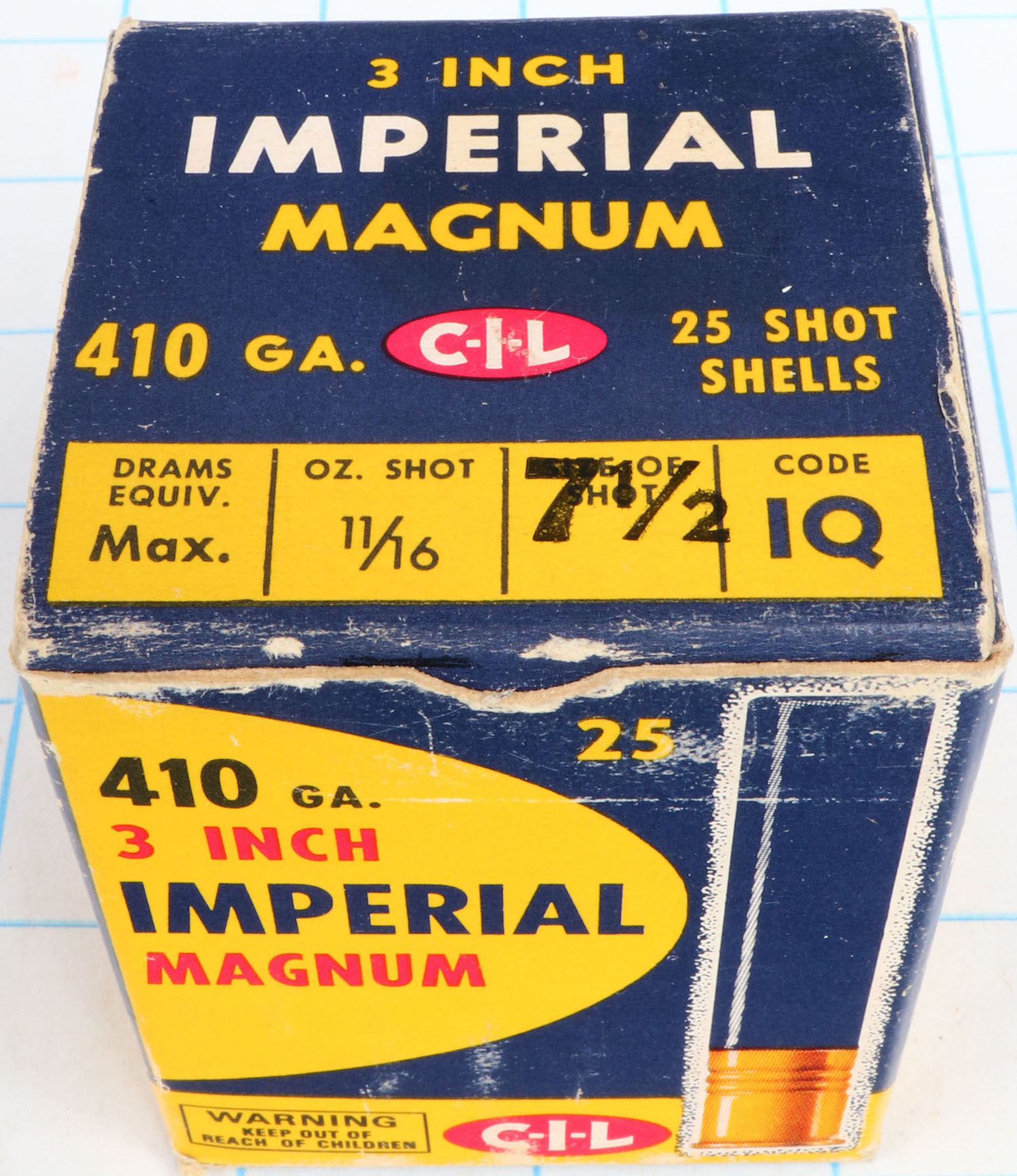 CIL, Imperial, 410ga., 1pc., Full, shot size 7 1/2, box is solid with great colors, paper Shells are excellent. Grade: Excellent + - Value: 10 to 30