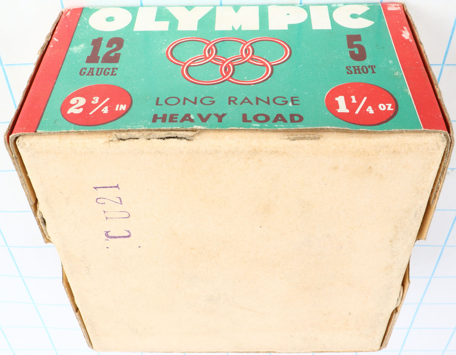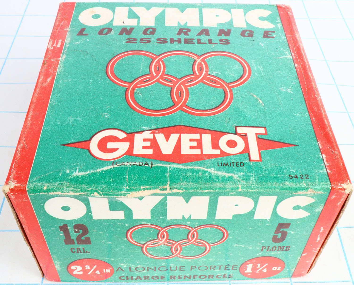 Olympic, Gevelot, 12ga., 2pc., Partial 16rds., shot size 5, multi-colored box, box is solid, Shells are excellent. Grade: Excellent - Value: 10 to 30