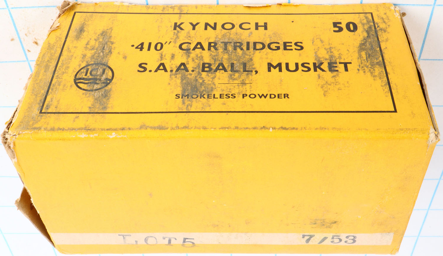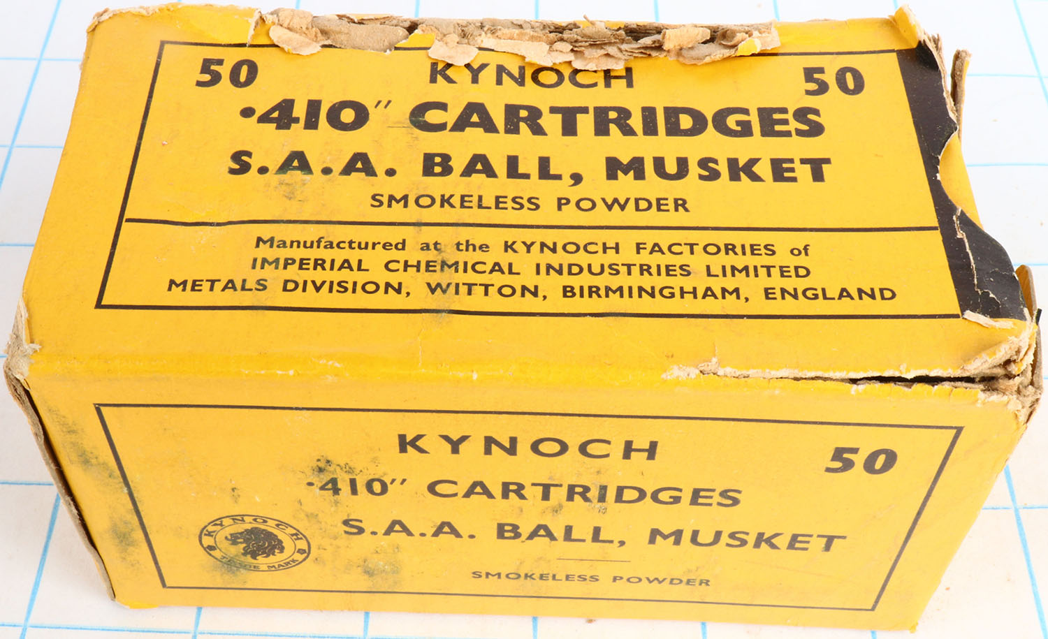 Kynoch, 410ga., 1pc., Full, shot size S.A.A. Ball Musket, multi-colored box, box seam splits, shells are excellent. Grade: Very Good ++ - Value: 10 to 30