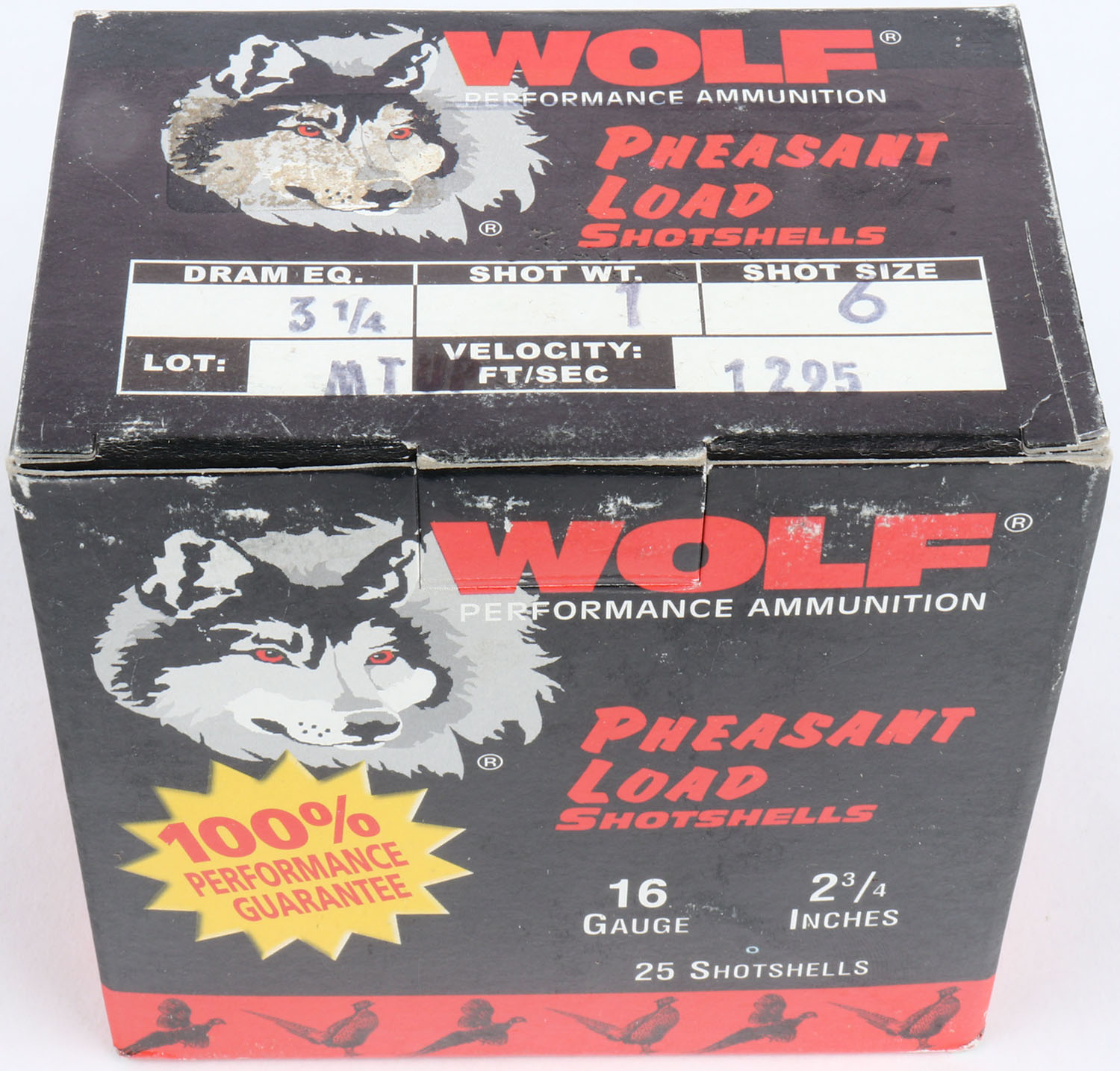 Wolf, Pheasant Load, 16ga., 1pc., Full, shot size 6, multi-colored box, box is very solid with very nice colors, Shells are excellent. Grade: Excellent - Value: 10 to 30