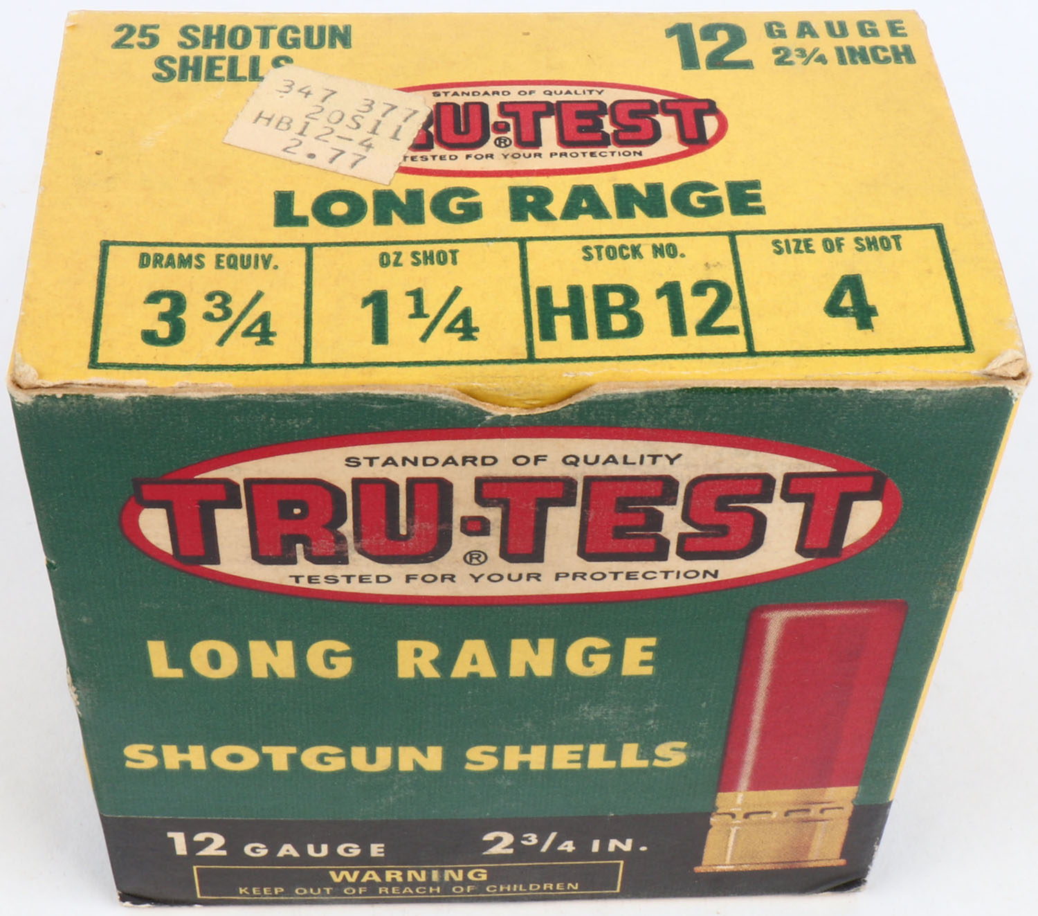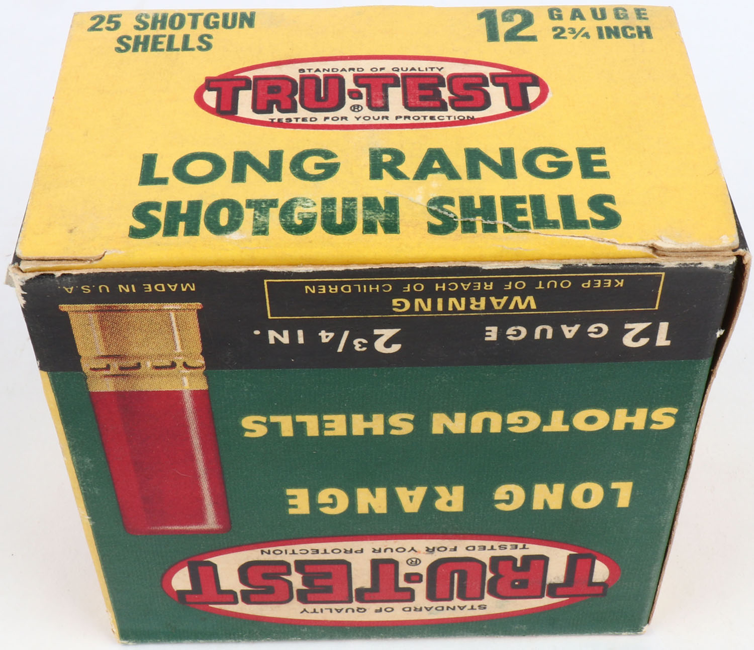 Tru-Test, 12ga., 1pc., Partial 23rds with 7rds being plastic, shot size 4, multi-colored box, box is solid with very nice colors, Shells are excellent. Grade: Excellent - Value: 8 to 30