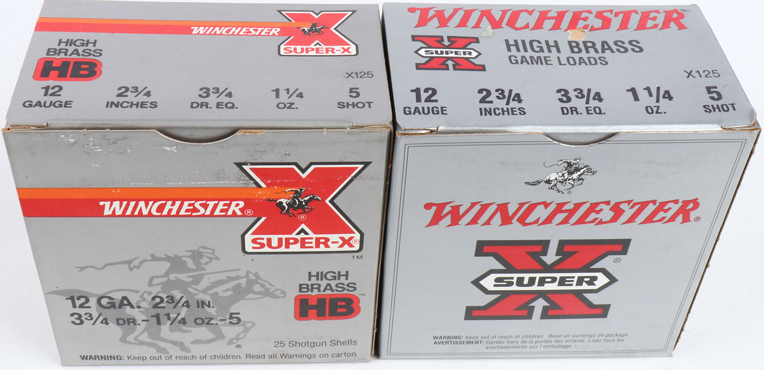 Lot of 2 Winchester, 12ga., 1pc., Appears Full, shot size 5, multi-colored box. Grade: Excellent - Value: 10 to 30