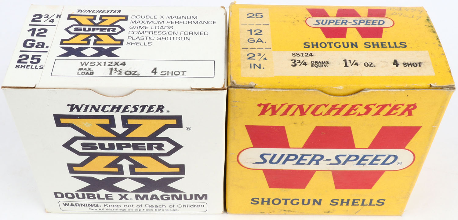 Lot of 2 Winchester, 12ga., 1pc., Appears Full, shot size 4, multi-colored box. Grade: Excellent - Value: 10 to 30