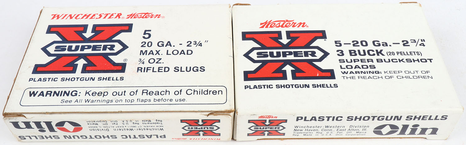 Lot of 2 Winchester-Western, 20ga., 1pc., Appears Full, shot size 3 Buck & Rifled Slugs, multi-colored box. Grade: Excellent - Value: 10 to 30