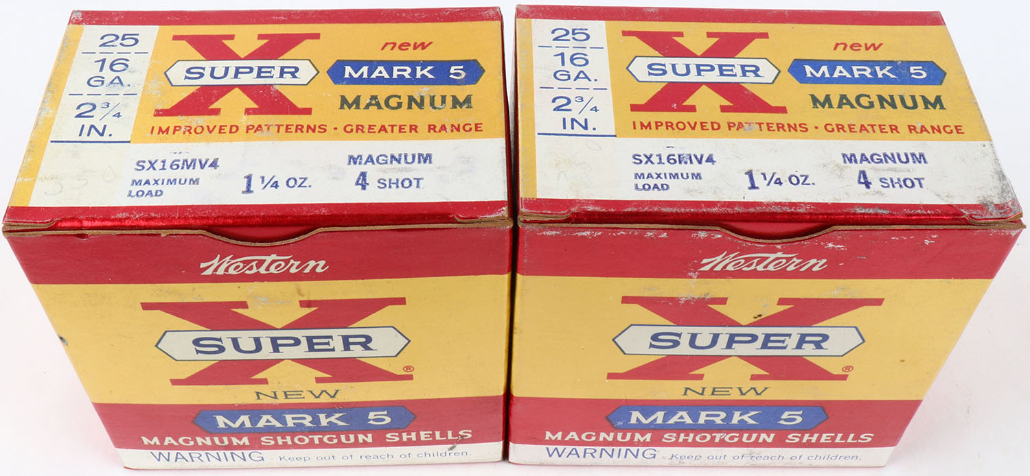 Lot of 2 Western, 16ga., 1pc., Appears Full, shot size 4 Magnum, multi-colored box. Grade: Excellent - Value: 10 to 30