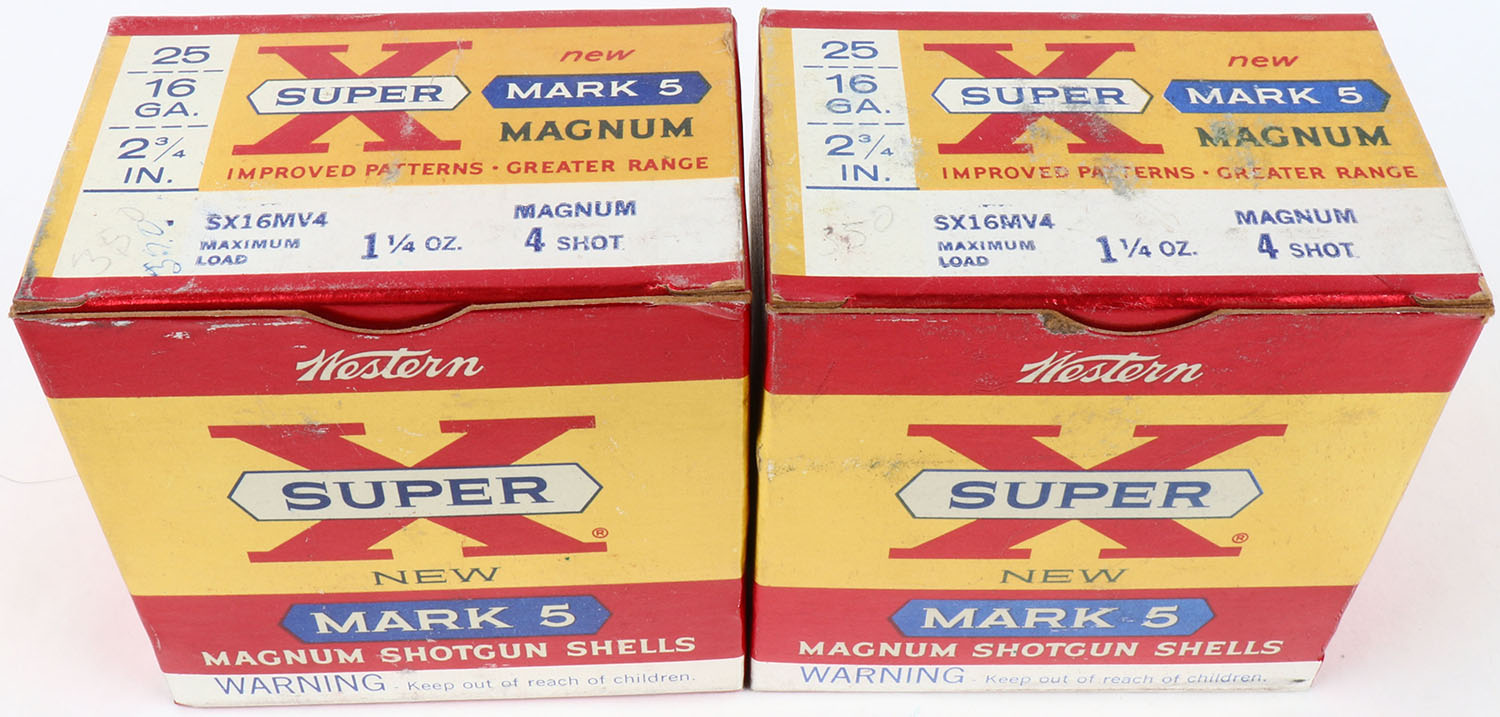 Lot of 2 Western, 16ga., 1pc., Appears Full, shot size 4 Magnum, multi-colored box. Grade: Excellent - Value: 10 to 30