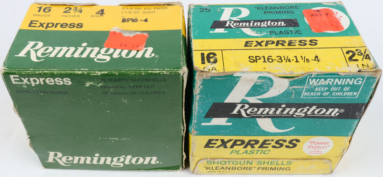 Lot of 2 Remington, 16ga., 1pc., Appears Full, shot size 4, multi-colored box. Grade: Very Good ++ - Value: 10 to 30