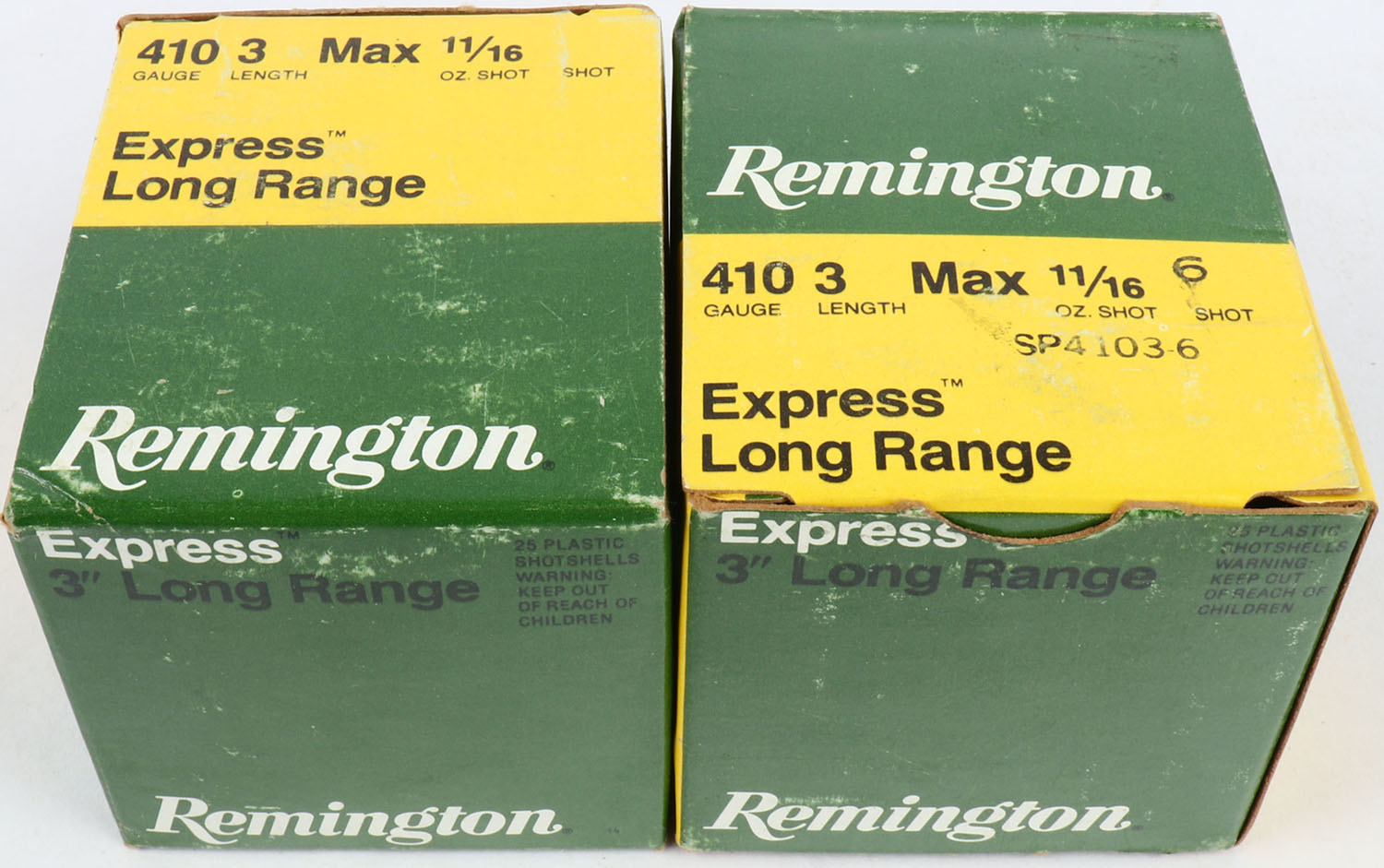 Lot of 2 Remington, 410ga., 1pc., Appears Full, shot size 6, multi-colored box. Grade: Excellent - Value: 10 to 30