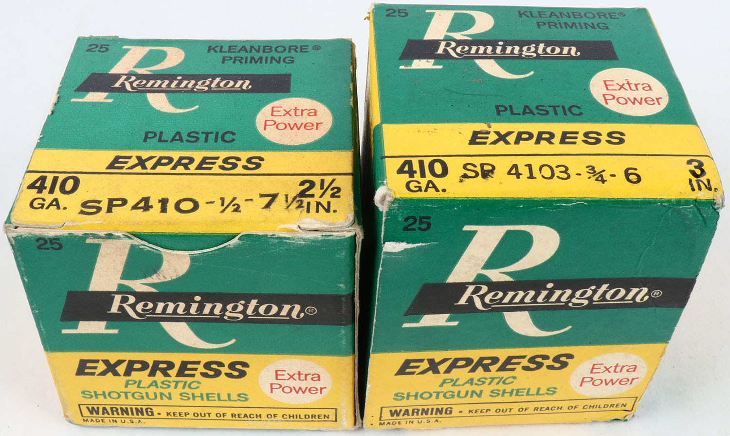 Lot of 2 Remington, 410ga., 1pc., Appears Full, shot size 7 1/2 & 6, 3'' & 2 1/2'', multi-colored box. Grade: Excellent - Value: 10 to 30