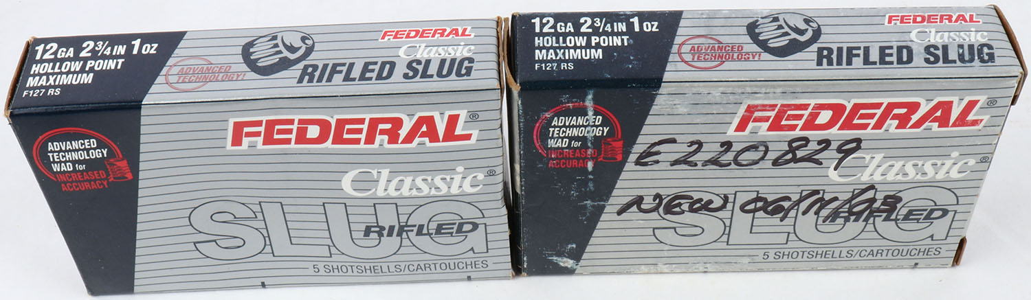 Lot of 2 Federal, 12ga., 1pc., Appears Full, shot size Rifled Slug, multi-colored box. Grade: Excellent - Value: 10 to 30