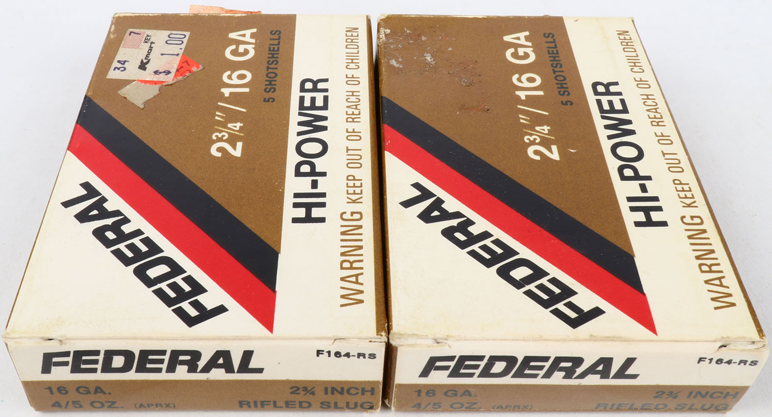 Lot of 2 Federal, 16ga., 1pc., Appears Full, shot size Rifled Slug, multi-colored box. Grade: Excellent - Value: 10 to 30