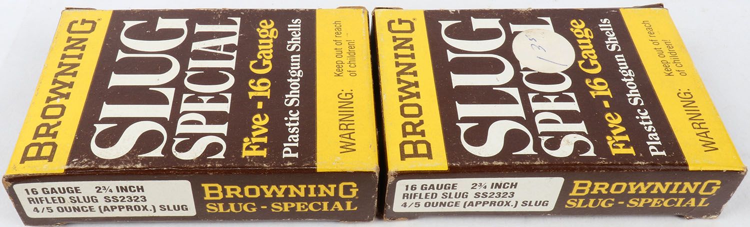 Lot of 2 Browning, 16ga., 1pc., Appears Full, shot size Rifled Slug, multi-colored box. Grade: Excellent - Value: 10 to 30