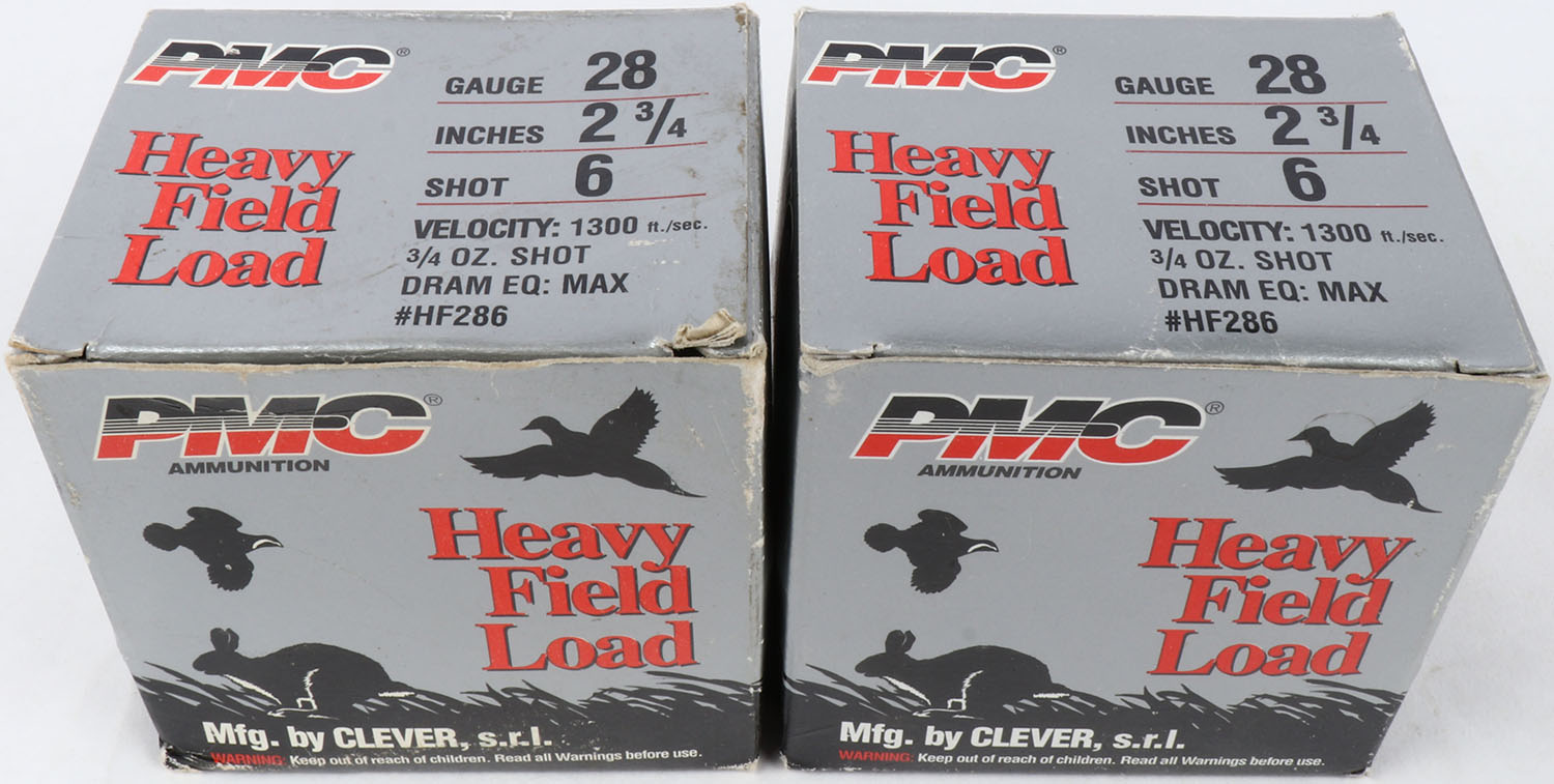 Lot of 2 PMC, 28ga., 1pc., Appears Full, shot size 6, multi-colored box. Grade: Excellent - Value: 10 to 30
