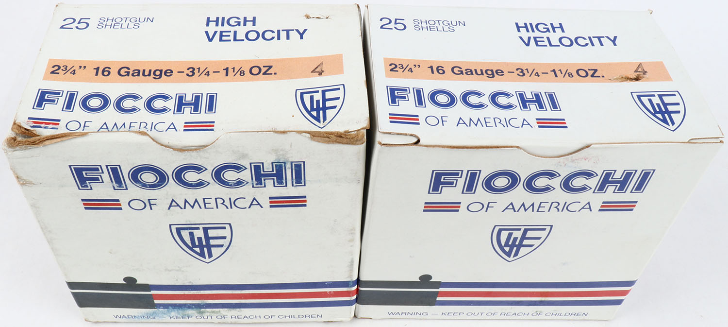 Lot of 2 Fiocchi, 16ga., 1pc., Appears Full, shot size 4, multi-colored box. Grade: Excellent - Value: 10 to 30
