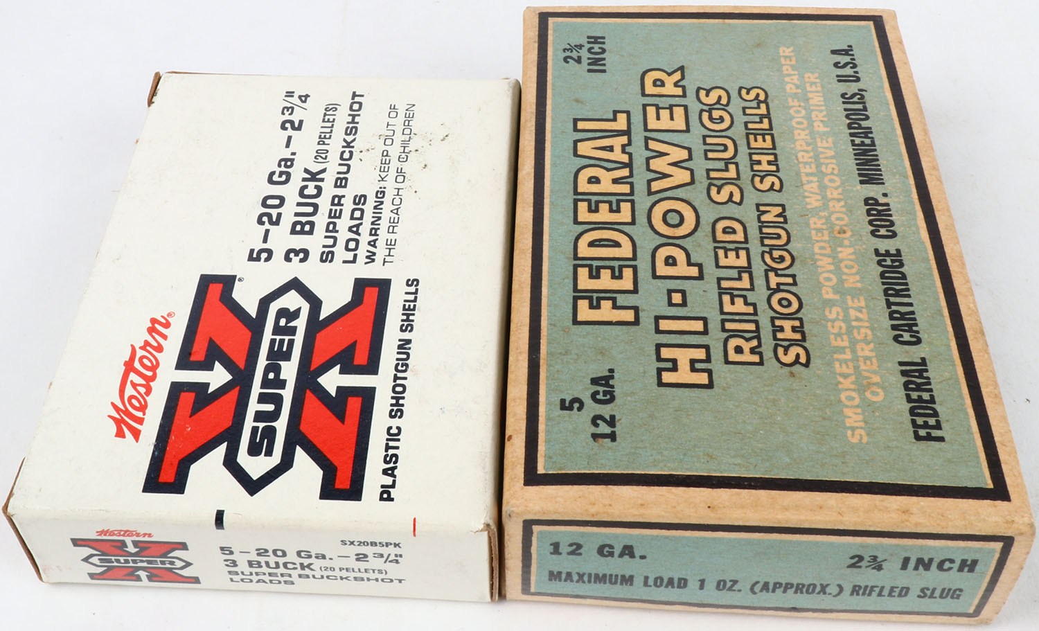 Lot of 2 Western/Federal, 12ga. & 20ga., 1pc., Appears Full, shot size Rifled Slug & 3 Buck, multi-colored box. Grade: Excellent - Value: 10 to 30