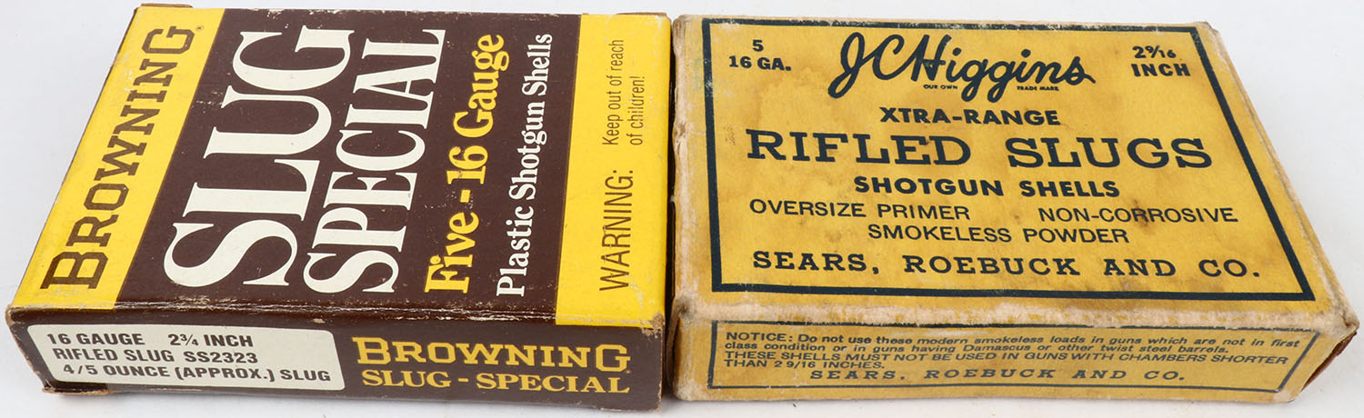Lot of 2 Browning/JC Higgins, 16ga., 1pc., Appears Full, shot size Rifled Slug, multi-colored box. Grade: Excellent - Value: 10 to 30
