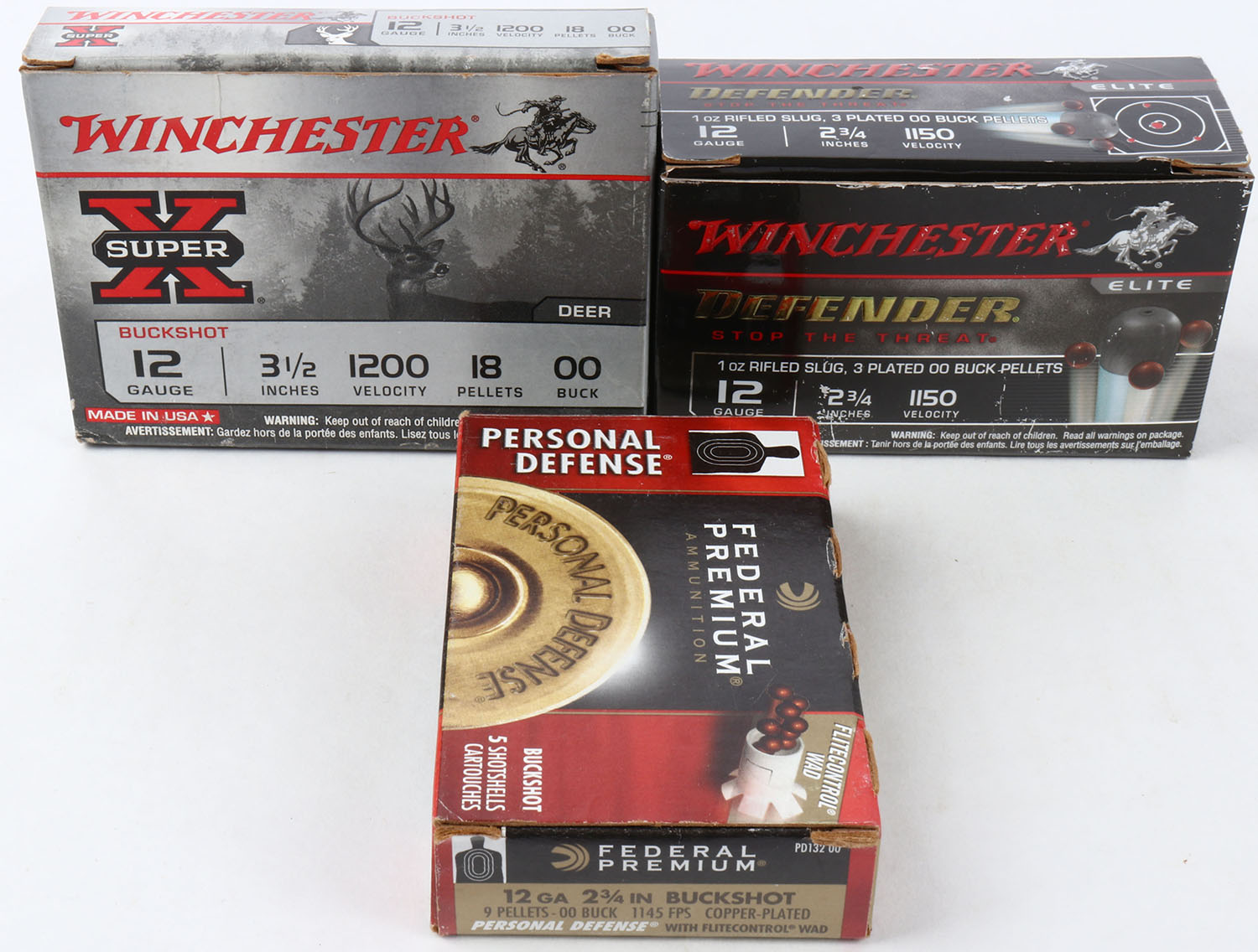 Lot of 3 Winchester/Federal, 12ga., 1pc., Appears Full, shot size 00 Buck & 1oz Rifled Slug with 3 Plated 00 Buck Pellets, multi-colored box. Grade: Excellent - Value: 10 to 30