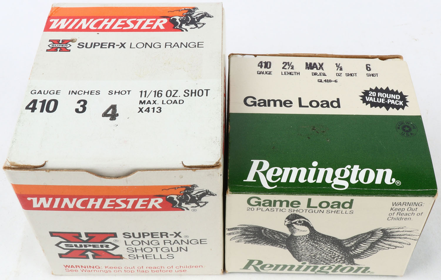 Lot of 2 Winchester/Remington, 410ga., 1pc., Appears Full, shot size 6 & 4, 3'' & 2 1/2'', multi-colored box. Grade: Excellent - Value: 10 to 30