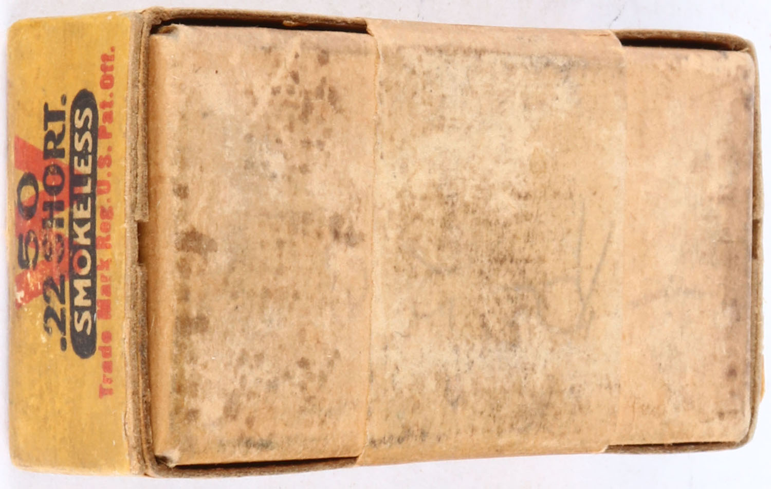 Winchester, Smokeless Rifle Cartridges, .22 Short, RR: WRA-57 S-24e, FULL & SEALED, 2pc. Buff box with green top & orange side sealing labels, box is solid with very good to excellent color, some age soiling, minor shelf wear, very minor edge & corner wear, labels are intact. Grade: Excellent - Value: 50 to 150