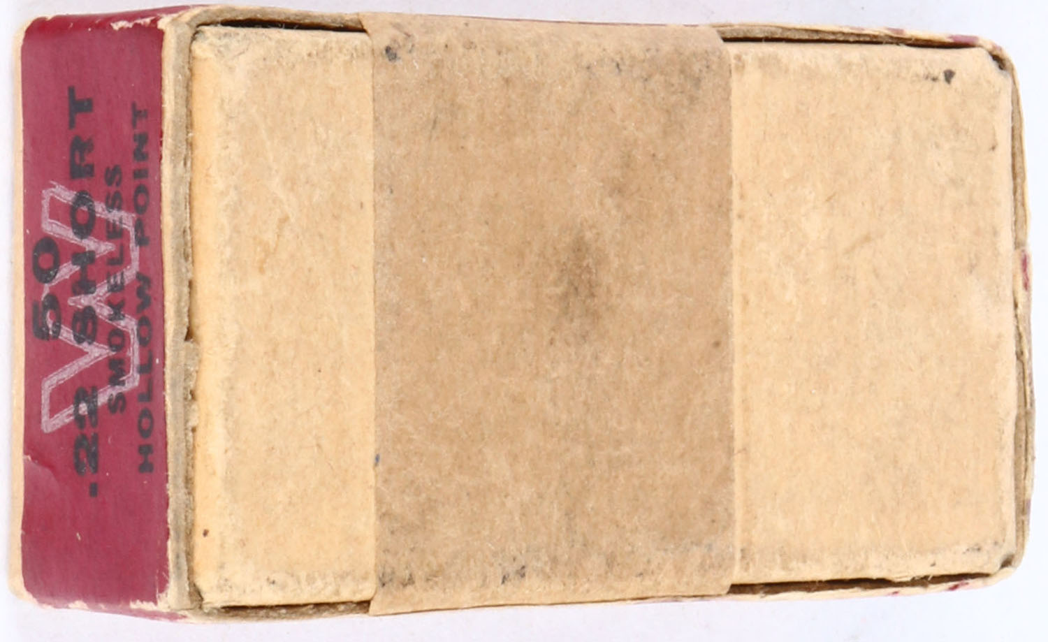 Winchester, Smokeless Rifle Cartridges, .22 Short Hollow Point, RR: WRA-75 S-54, FULL & SEALED, 2pc. Buff box with red top & side sealing labels, box is solid with excellent color, some edge & corner wear, minor shelf wear, labels are intact. Grade: Excellent - Value: 200 to 600