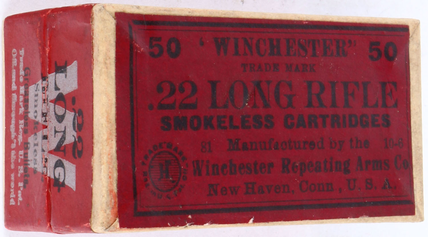 Winchester, Smokeless Cartridges, .22 Long Rifle, RR: WRA-115 LR-15b, FULL & SEALED, 2pc. Buff box with red top & side sealing labels, box is solid with excellent to minty color, very minor edge wear, corners are sharp, very minor staining to bottom, labels are intact. Grade: Excellent ++ - Value: 50 to 250