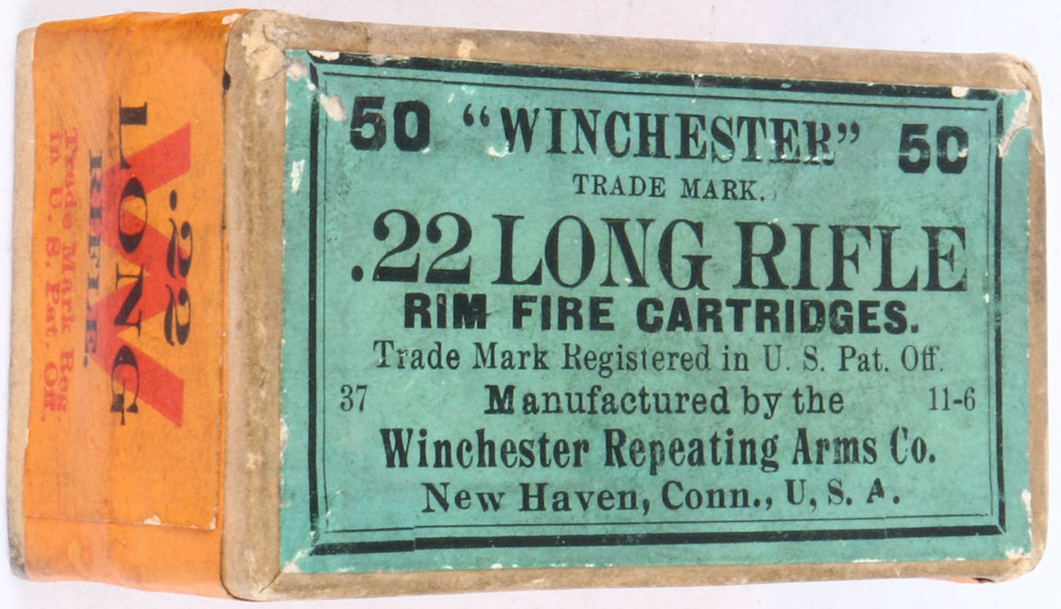 Winchester, Target Cartridges, .22 Long Rifle, RR: WRA-111 LR-6a, FULL & SEALED, 2pc. Buff box with green top & orange side sealing labels, box is solid with excellent color, minor age soiling & corner wear, edges are crisp, labels are intact. Grade: Excellent + - Value: 50 to 200