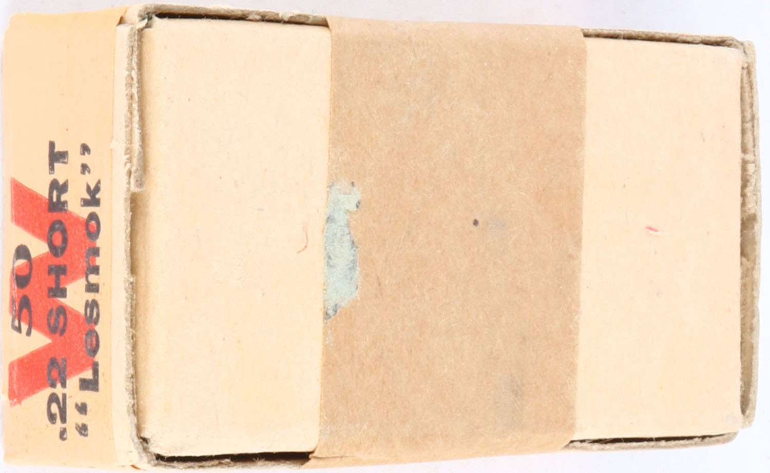 Winchester, ''Lesmok'' Rifle Cartridges, .22 Short, RR: WRA-69 S-37c, FULL & SEALED, 2pc. Buff box with green top & buff side sealing labels, box is solid with excellent to minty color, very small scuff to the top, corners are sharp, edges are crisp, labels are intact. Grade: Excellent ++ - Value: 50 to 150