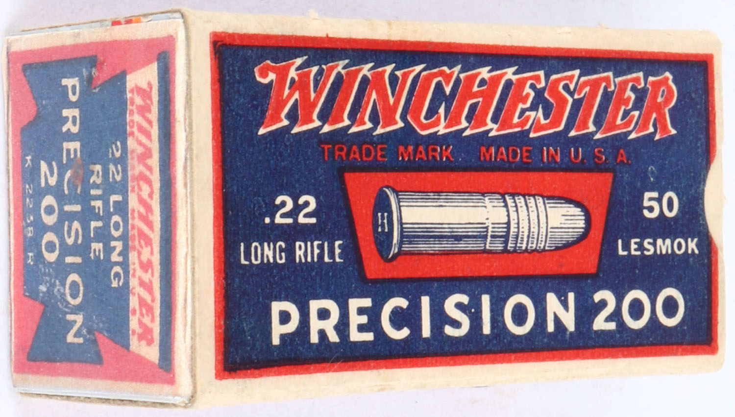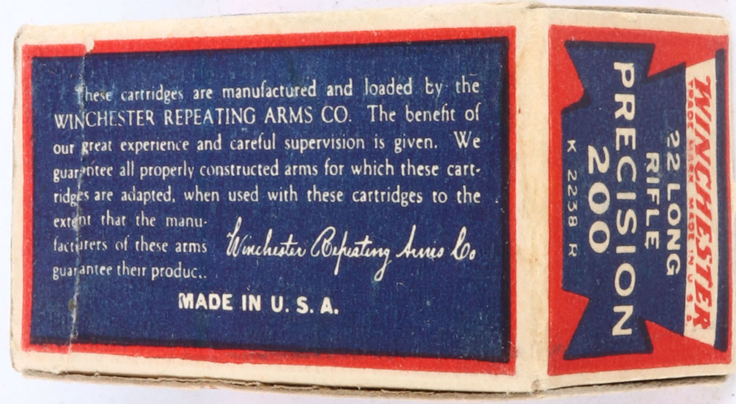 Winchester, Precision 200, .22 Long Rifle, RHWeb: WRA-53, LR-11b, Partial 1rd. Correct, 1pc. Blue red & white box, box is solid with excellent color, only very minor shelf wear, color fading to left end, corners are mostly sharp, edges are crisp, ammo is excellent. Grade: Excellent ++ - Value: 8 to 40