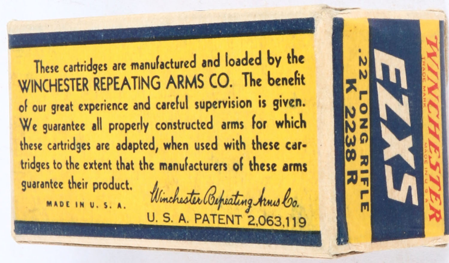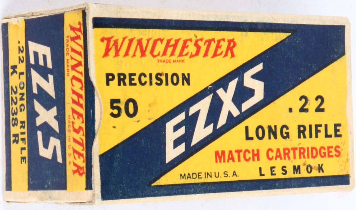 Winchester, EZXS, .22 Long Rifle, Match Cartridges, RHWeb: WRA-54 LR-3b, Full, 1pc. Yellow blue & white box, box is solid with excellent color, very minor age soiling & corner wear, edges are crisp, end flaps are solid, ammo is excellent. Grade: Excellent + - Value: 10 to 50