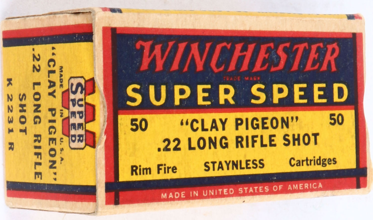Winchester, Super Speed, ''Clay Pigeon'', .22 Long Rifle Shot, RHWeb: WRA-15 LR-5b, Full, 1pc. Yellow blue & red box, box is solid with excellent color, minor age soiling, very minor corner wear, edges are crisp, end flaps are solid, ammo is excellent to minty. Grade: Excellent + - Value: 30 to 90